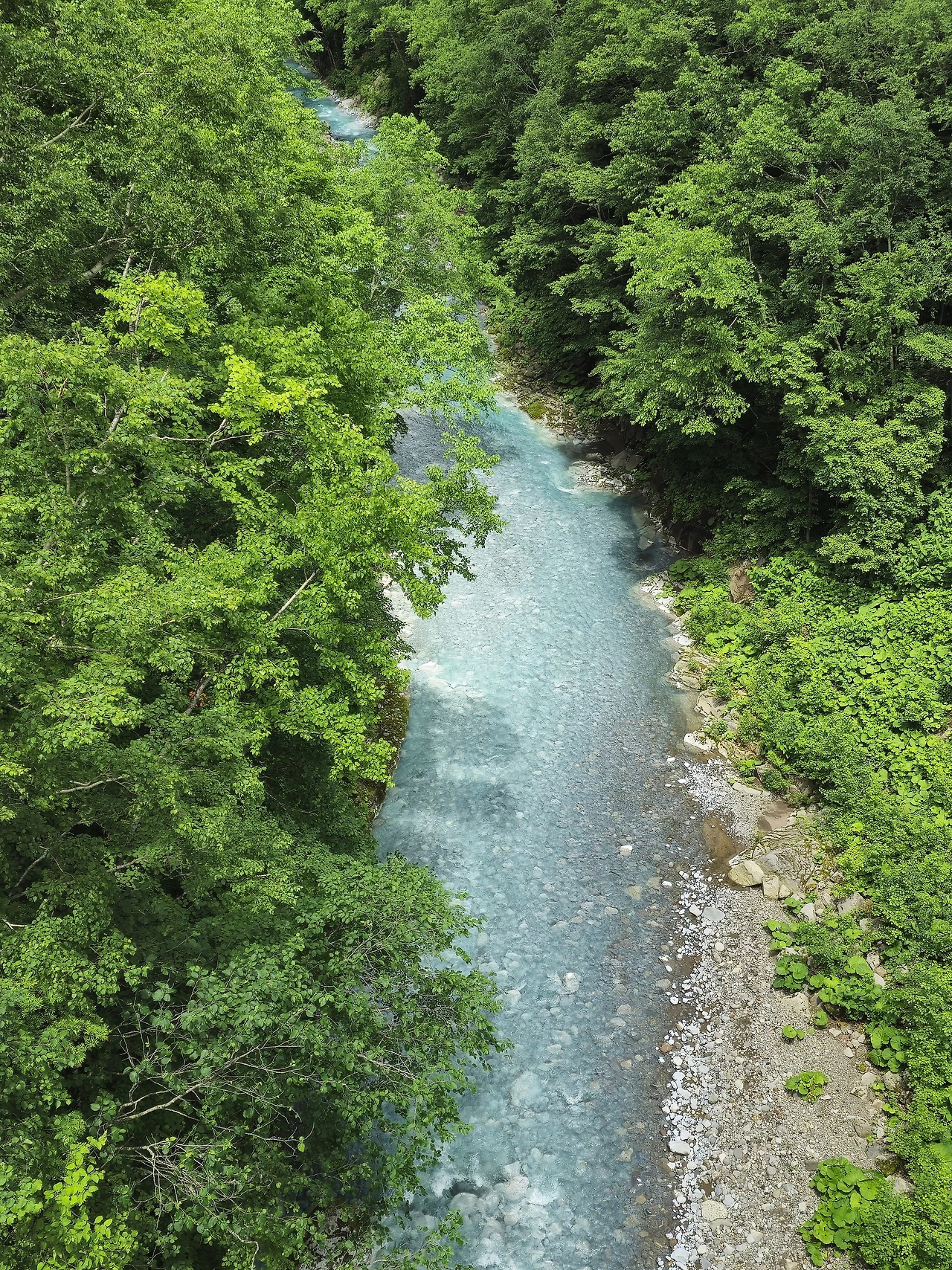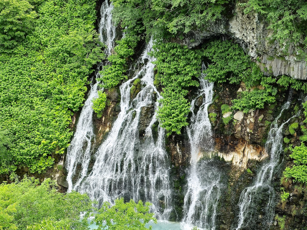 홋카이도에서 가장 높은 만년설이 보이는 이름도 대설산인 다이세츠잔(大雪山) 국립공원 초입에 위치해 있다. 비에이강 위에 철교에 올라가게 되면 폭포를 보게 된다. 이름이 왜 흰수염폭포인지 바로 알 수 있게 검은 돌 위로 물은 흰 색상을 띠며 뻗으면서 떨어지고 있었다. 객관적으로 사실 크기에 압도당하는 느낌도, 한국의 다른 폭포들과 다른 점이 크게 있는 것 같지도 않다. 그러나 주변 풍경들과 푸른 강이 주는 신비로움 때문인지 묘하게 계속 시선을 뺏기게 된다.