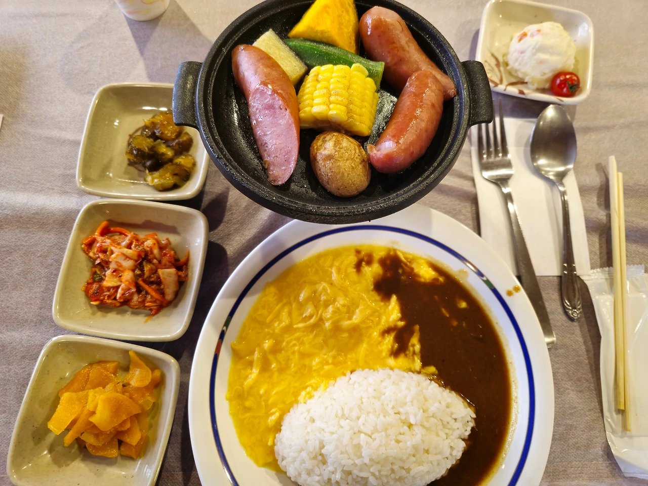 점심시간이 다 되어 점심을 먹기 위해 이동했다. 메뉴는 오므카레였다. 오므카레는 오므라이스 + 카레라이스로 말 그래도 오므라이스와 카레라이스를 섞은 음식이다. 우리가 간 곳은 버스 투어들이 가는 식당인 것 같았다. 자리에는 감자, 옥수수, 호박, 소시지 등이 구워지고 있었고, 직원들이 밥을 담아서 그릇을 주면 기호에 맞게 오므라이스와 카레라이스를 위어 올려먹으면 됐다. 느낌은 한국 급식과 같은 느낌이라 일본 음식다운 것은 모호하긴 했다.