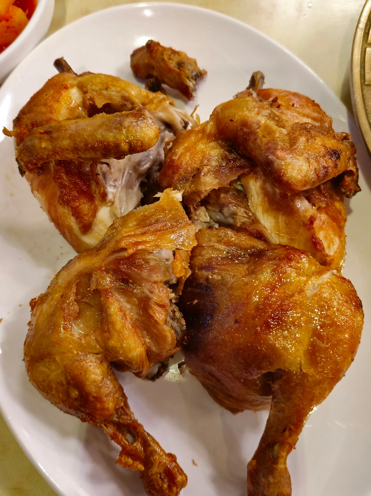 그렇게 먹고 있으면 전기구이가 나온다. 닭이 4 등분되어 나와 살코기를 바로 먹을 수 있다. 전기구이는 기름이 다 빠져 조금 뻑뻑하게 느껴진다. 반찬은 깍두기, 김치, 무, 소금, 머스터드가 나오는데 비교적 삼계탕과 전기구이의 간이 약하기 때문에 더욱 물리지 않고 먹을 수 있게 만들어 준다.