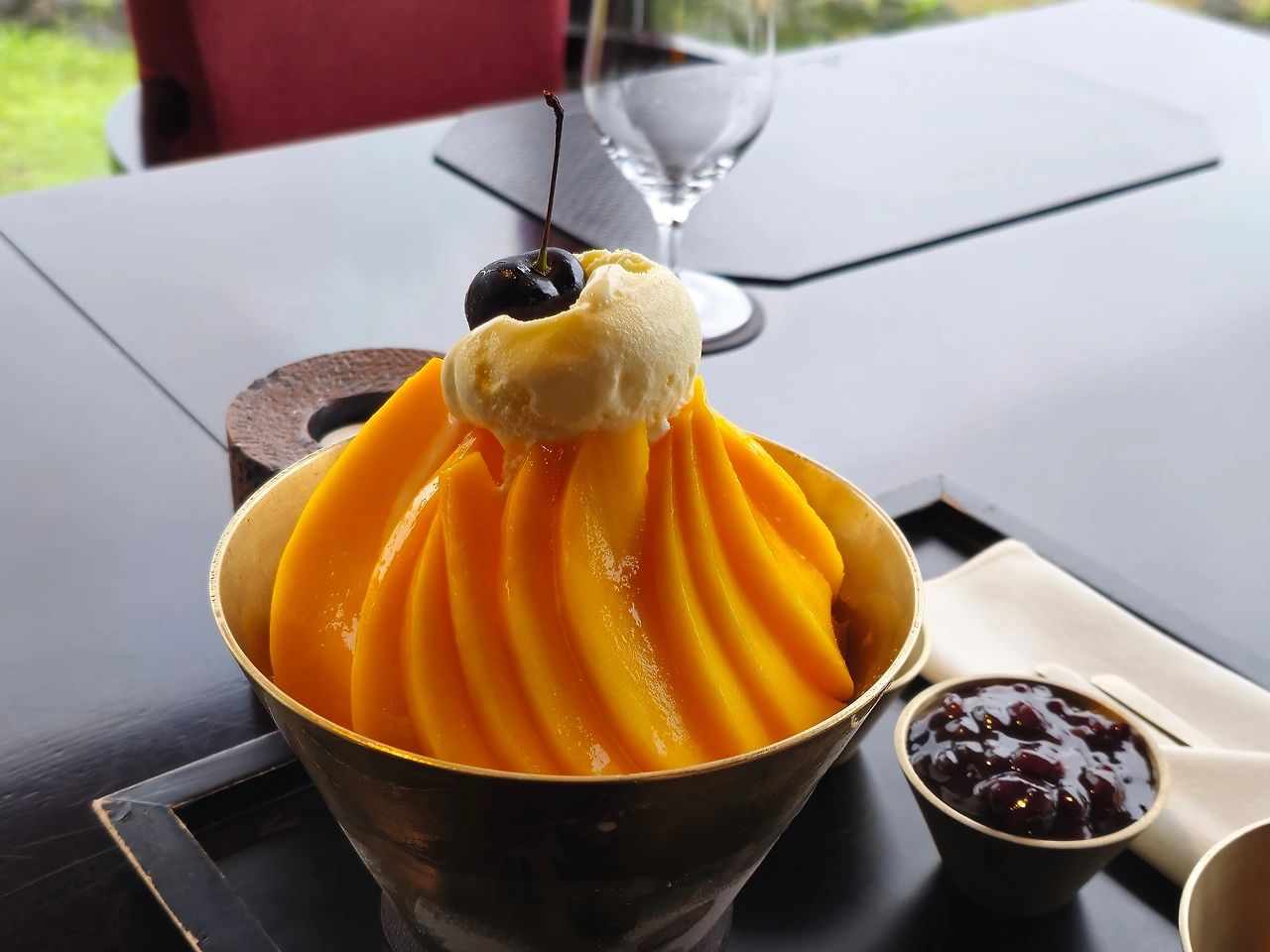 첫 번째 방문은 체크인을 하자마자 방문하였다. 바로 100% 제주산 애플망고 빙수를 먹기 위해서였다. 가격은 7만 6천 원으로 다른 호텔에 비하면 저렴하다고 볼 수 있었다. 빙수는 식당 브레이크타임에도 이용가능하며, 저녁시간이 시작되면 식당 사정에 따라 제공이 안 될 수도 있다고 한다. 우유 눈꽃 빙수 위에 제주산 애플망고를 겹겹이 쌓고 맨 위에는 바닐라 아이스크림이 올려져 있다. 수제 팥과 망고 퓨레도 함께 나와 맛을 조절하면서 먹을 수 있었다. 빙수를 먹고 나니 딱 건축 예술 가이드 시간이었다.