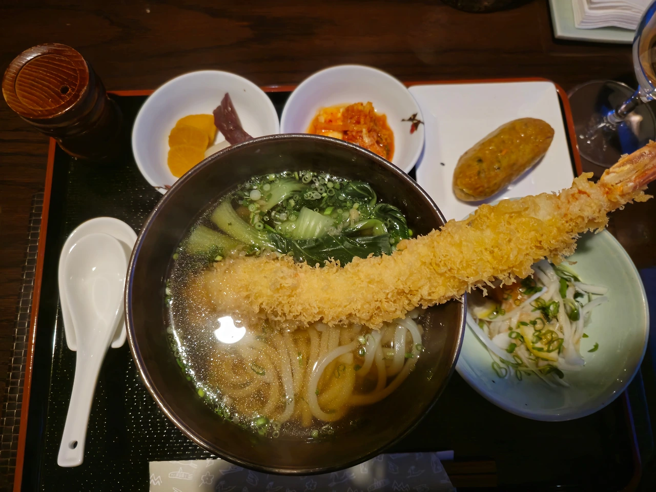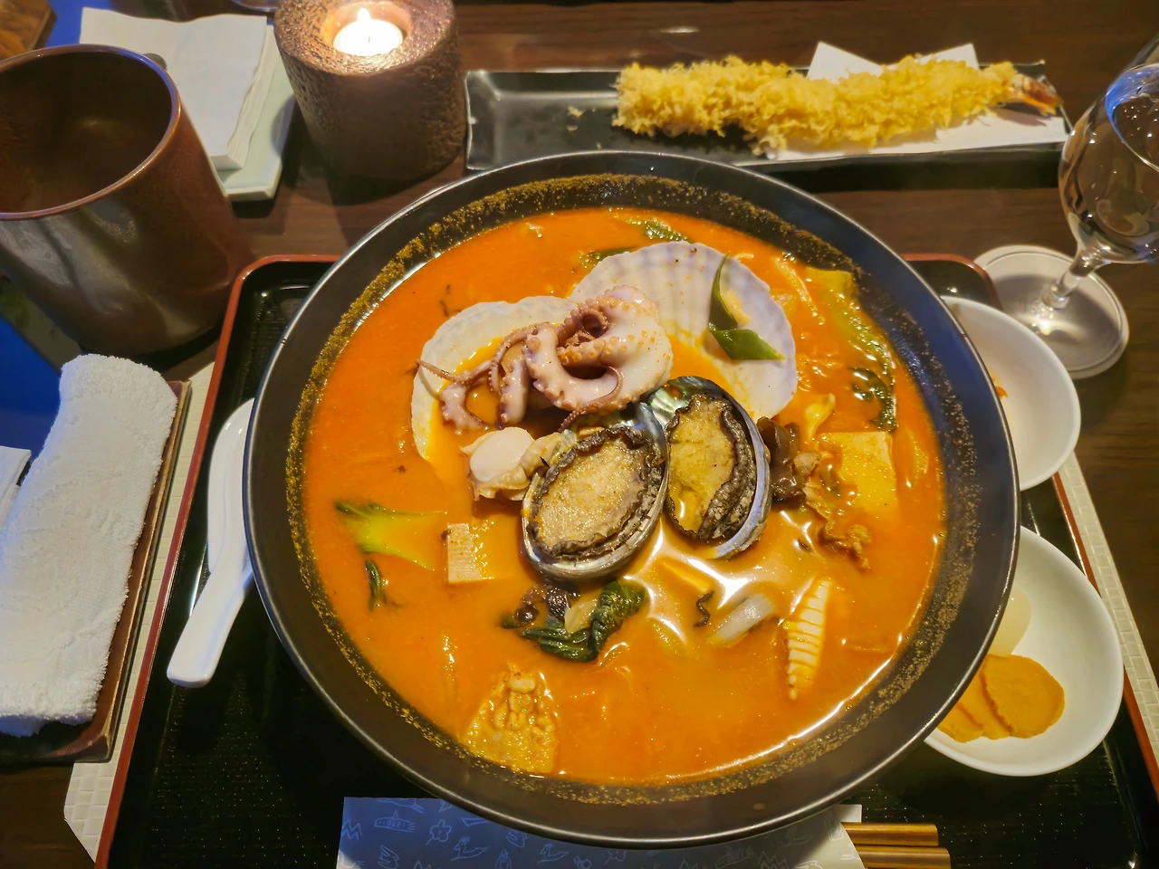 왕새우튀김우동정식은 대표메뉴라 가격은 다른 메뉴에 비해 많이 저렴하였다. 그래서 그런지 맛에도 별다른 특색은 없었지만, 새우튀김은 왜 앞에 왕이 붙는지 증명이라도 하듯 엄청난 크기의 튀김이 나왔다. 짬뽕우동에는 각종 해물이 들어 있어 맛있게 기력을 보충할 수 있었다.