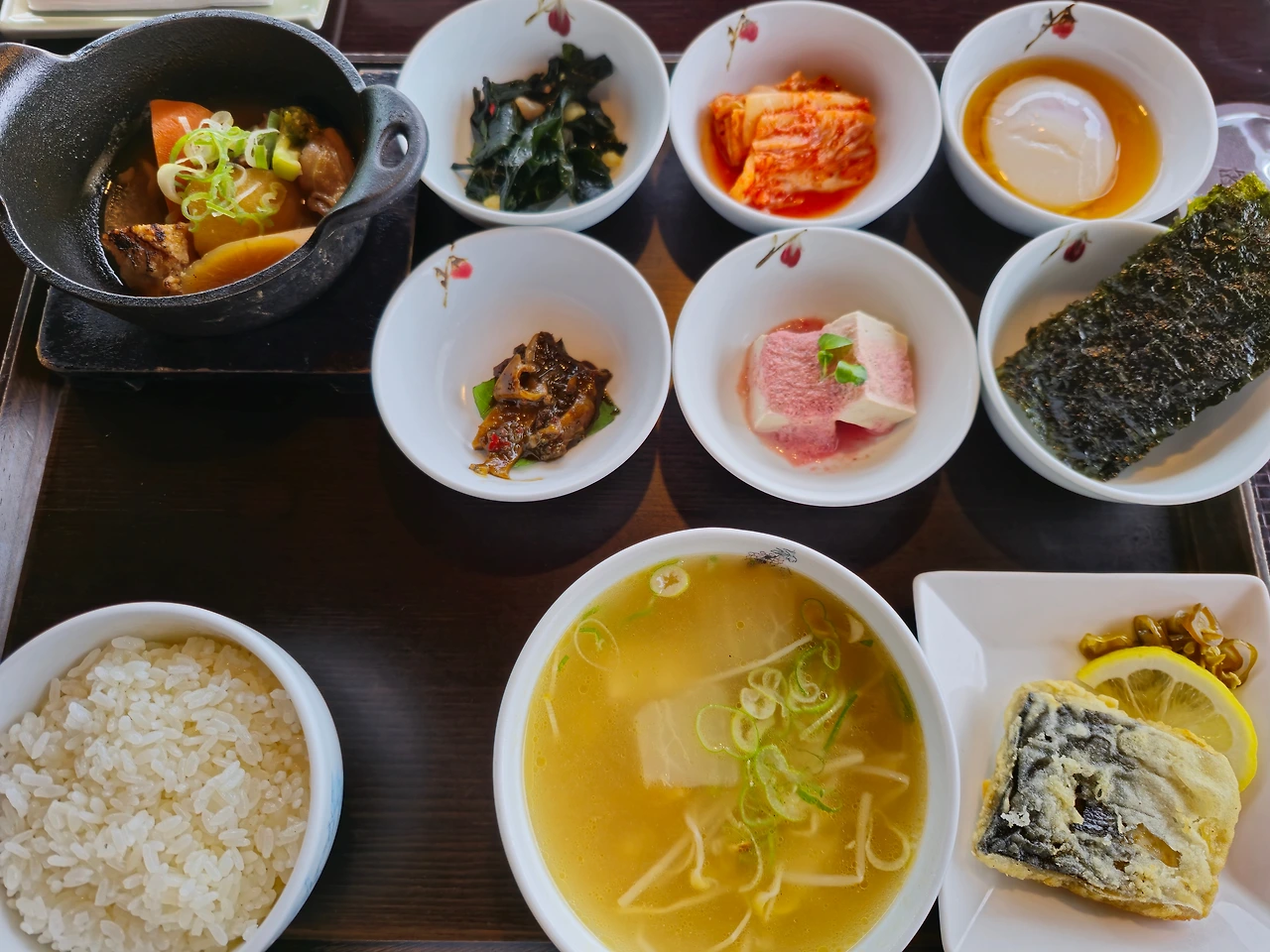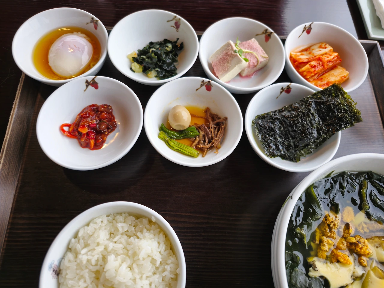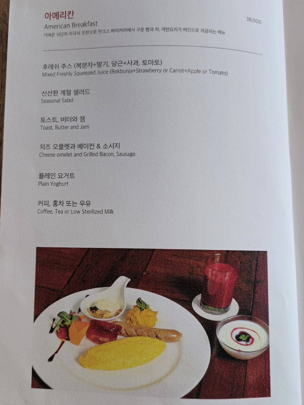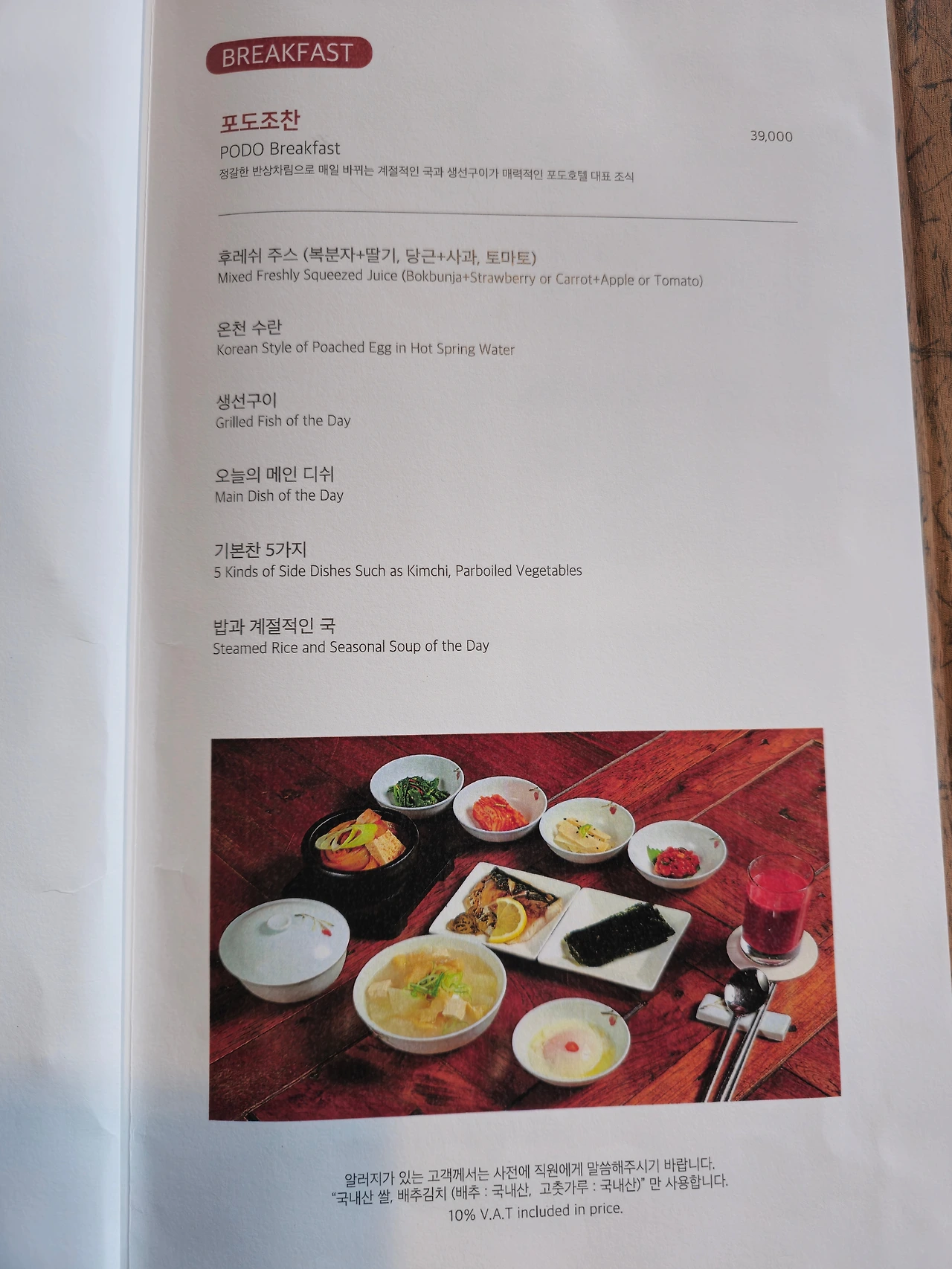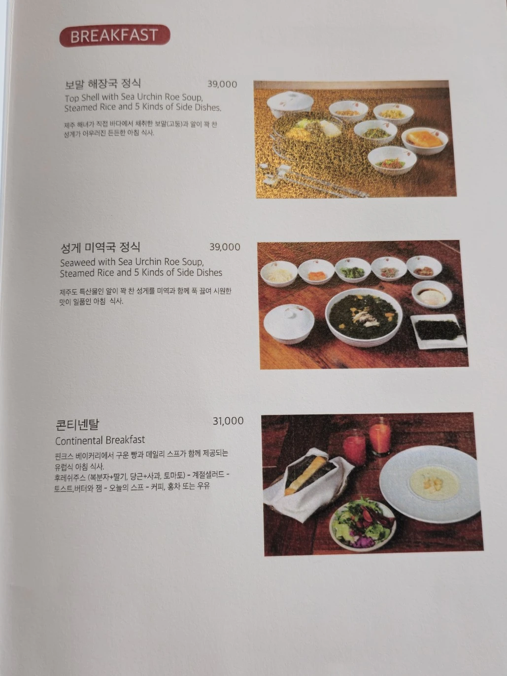 마지막은 다음 날 조식을 먹기 위해 방문하였다. 조식은 4-5가지 중에 선택을 하면 되며, 우리는 포도조찬과 성게미역국 정식을 시켰다.