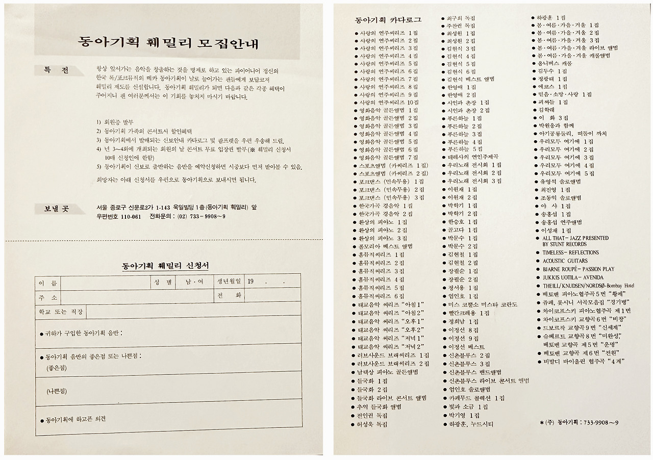 동아기획이라는 네임만으로도 많은 가수를 만났다. 음악을 접하고 찾아듣는 것이 쉽지 않던 시절이었기 때문에 그 신뢰감은 더욱 맹목적이었다. 중학교 수학 여행때 같은반 친구 하나가 잘 치지도 못하는 기타와 그 시절 유행하던 가요대백과 책을 가지고 왔다. 그리고 어설픈 실력으로 기타 연주를 시도하다 결국은 카세트 테이프로 노래 하나를 들려주었는데 그 노래가 김현철의 '동네'였다. 고등학교 때부터 작곡 작사를 직접하고 이제 겨우 20살밖에 안된 동아기획 소속 가수라며 1집 음반을 들려줬는데 그 음악은 꽤나 충격적이었다. 뭔가 세련되면서도 따뜻한 느낌이랄까.. 아마도 역시 동아기획이라고 생각했을 것이다. 그렇게 감성 충만하던 시기에 지금까지도 가장 많이 듣고 있는 동아기획 음악들을 하나 둘 만나게 되었다.