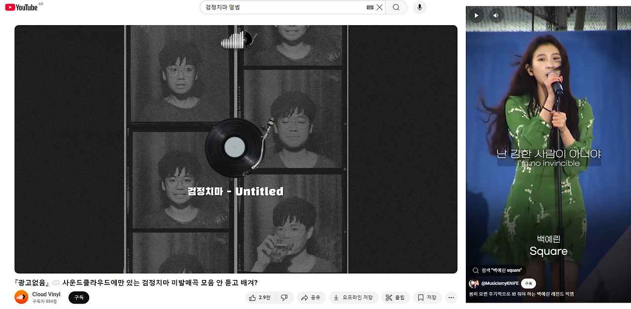 그럼에도 불구하고 유튜브로 듣는 음악의 가장 큰 장점은 정규 앨범 발매 곡뿐만아니라, 방송 출연 영상, 각종 공연 등 라이브 영상, 심지어 사운드클라우드에만 소개되었던 미발표곡들까지 없는게 없다는 점이다. 어떤 뮤지션이 궁금해진다면 끝없이 탐구할 수 있다. 마치 소리바다를 헤매며 불법 mp3파일을 건지던 그 때처럼...