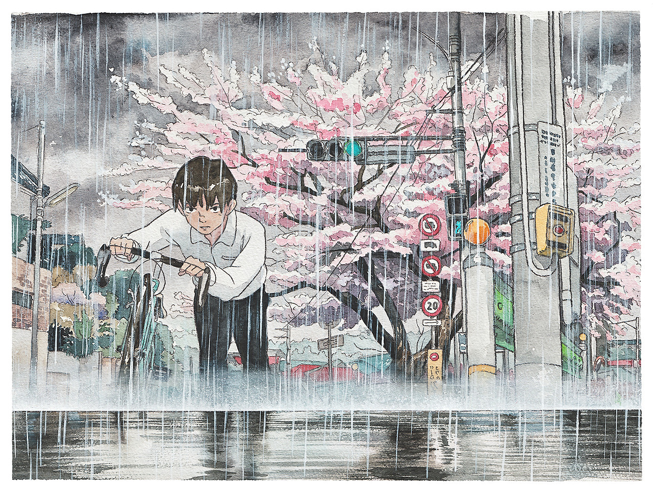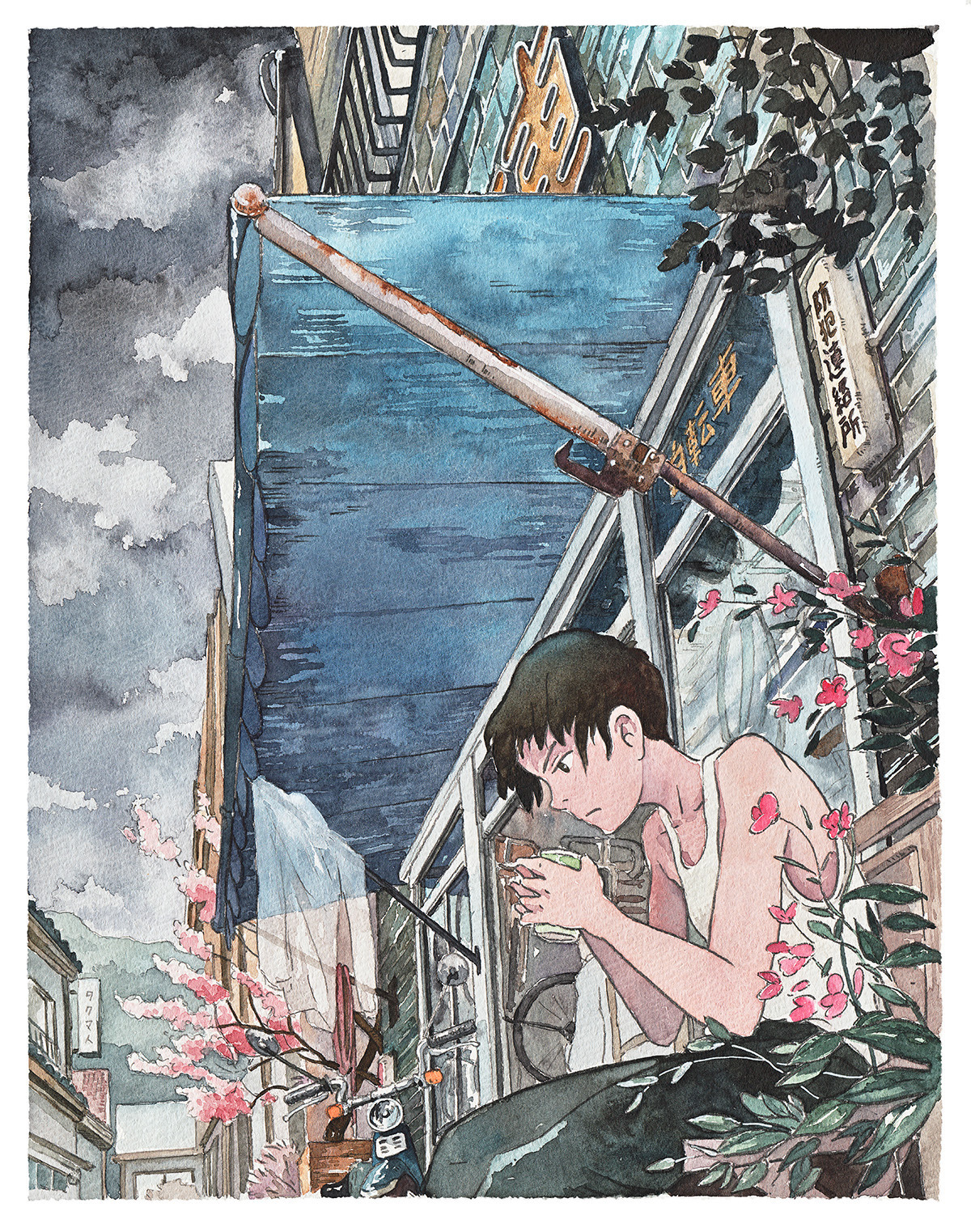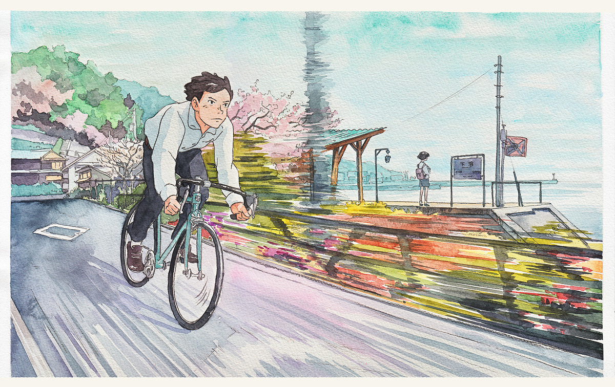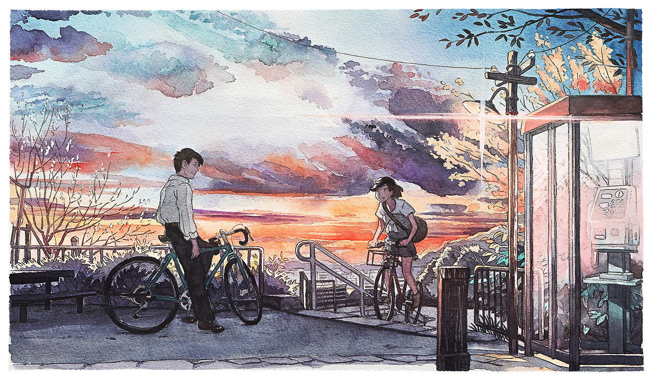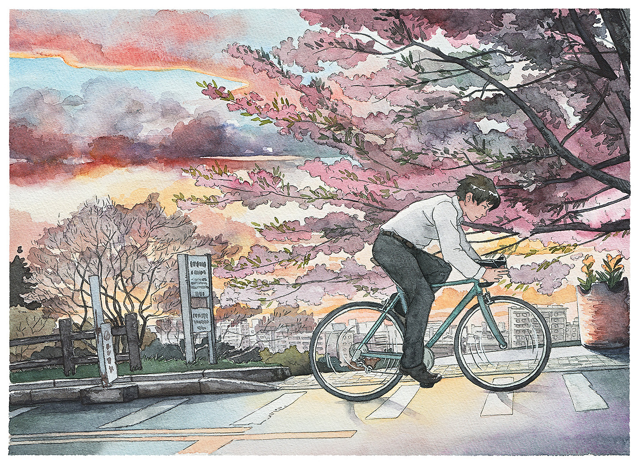 수채화 작업으로 완성되는 그의 그림은 일본 애니메이션의 감수성을 품고 있습니다. 아래 사진에 수록된 자전거 소년(BicycleBoy)이라는 제목을 가진 시리즈는 지브리 스튜디오 영화 <귀를 기울이면>에서 영감을 받아 목표를 달성하기 위해 자전거를 타는 소년의 하루를 10개의 컷으로 완성했다고 하네요.