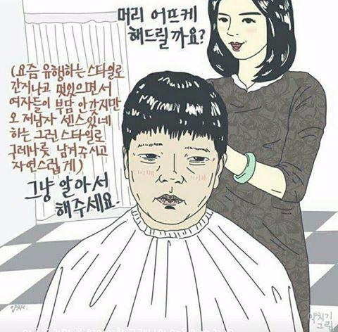 : 그러나 지금 미용사는 묵묵히 그리고 섬세하게 머리카락을 자른다. 요구 사항을 확인할 질문만 한다.