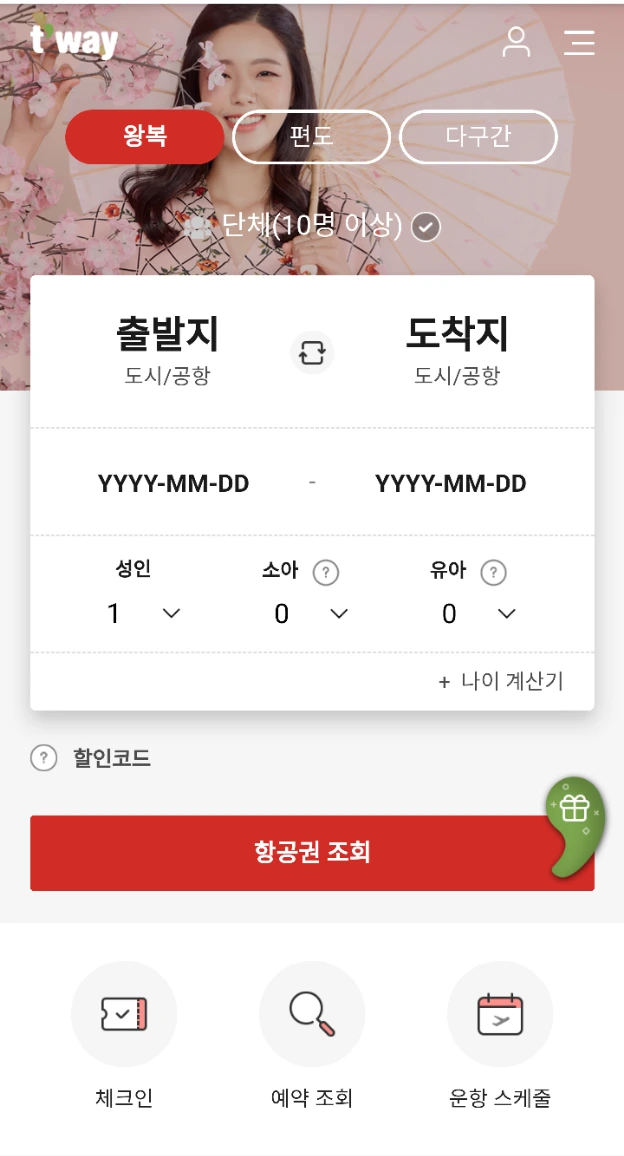 티웨이 모바일 웹 메인 화면