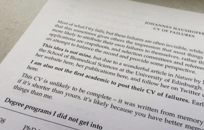 2016년 당시 프린스턴 대학교 조교수(현재는 코넬대학교 교수) 요하네스 하우스호퍼(Johannes Haushofer)는 자신의 "실패 이력서"라는 이상하고 재미있는 게시물을 트위터에 올렸습니다.