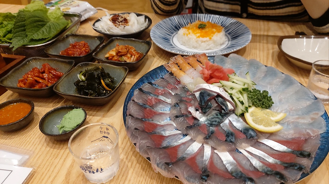 해가 진 다음에는 저녁을 먹으러 갔다. 고등어, 딱새우와 광어회가 나오는 모둠회와 한라산 한 병을 시켰다. 양이 제법 푸짐했고 고등어회 먹는 법이 적힌 종이를 볼 때부터 마음이 설렜다. 함께 나온 김에 회와 알밥과 양파를 싸서 입에 넣자 벌써 눈이 커지고 미간은 찌푸려져서 친구와 마주 본다. 평소에는 회는 회 맛으로 먹는 거라며 와사비에 간장만 조금 찍어 먹는 편이었지만 짭짤한 김과 아삭하게 씹히는 양파의 맛을 한 번 보니 계속 새로운 조합이 궁금해졌다. 김 위에 반찬을 뺐다가 추가했다가 쌈장도 넣어 보고… 역시 도전은 할수록 좋다. 특히 모르는 음식을 먹을 때는.