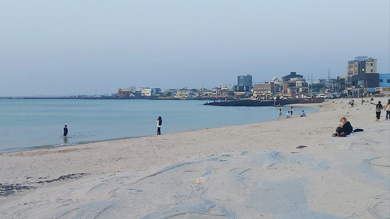 국수를 깨끗하게 비운 후엔 버스를 타고 숙소로 향했다. 정류장까지 걸어가는 동안 다른 어느 곳보다 커다란 비행기가 머리 위로 지나갔다. 식당이 공항 근처라서 볼 수 있는 광경이었다. 우리는 캐리어와 다리 두 쌍을 좌석과 좌석 사이에 끼운 채 한 시간을 달려 협재 해변에 도착했다. 숙소에 짐을 풀어놓고 해변으로 가니 이미 해가 질 시간이라 한산했다. 하얀 모래사장 위로 검고 울퉁불퉁한 돌바닥이 층을 이뤄 육지에서 가봤던 다른 해변과 사뭇 다른 느낌이었다. 앞서 간 사람들이 빼곡히 쌓아 놓은 돌탑들을 조심히 피해 물가로 다가가 투명한 수면을 보자 이제야 제주도에 도착한 느낌이었다.