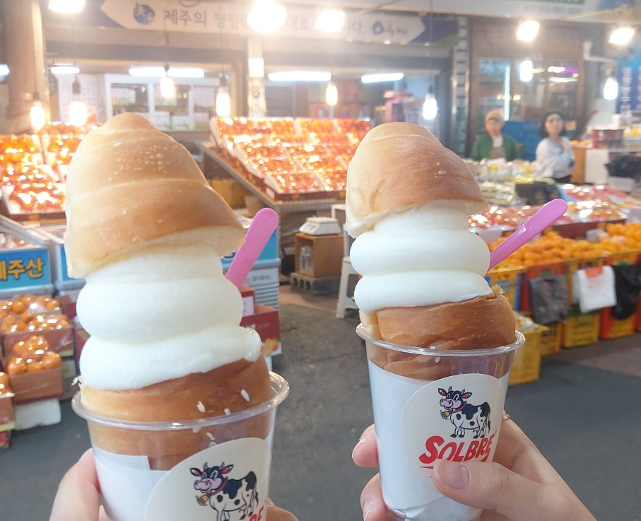 마지막 일정은 동문시장 탐방이었다. 옷가게에서 시장까지는 가까웠다. 제주목관아를 지나 걷다 보니 작은 하천과 맞은편의 유명한 아이스크림 가게가 눈에 들어왔다. 우선 기념품과 다른 먹거리를 먼저 구경하고 나오는 길에 아이스크림을 사 먹기로 했다. 동문시장 안은 선물로 사갈 먹거리를 사가려는 여행객들로 북적였다. 귤이나 한라봉 모양의 기념품들은 가게마다 종류가 비슷했지만, 그중 하나 눈에 띄는 게 있었다. 나는 보통 여행 선물이라도 장식품보다는 간식거리를 사 오는 걸 좋아하지만 이날은 내 가방에 달 귤 키링을 하나 샀다. 흰 속껍데기까지 충실하게 표현된 그 가짜 귤 한 조각이 너무 귀여웠다. 우리는 각자 키링과 청귤잼, 우도땅콩샌드, 한라봉타르트 같은 것들을 가득 사들고 나와 아이스크림을 먹었다. 우유향이 진한 아이스크림으로 채운 소금빵을 먹으면서 공항에 가기 전까지 강가를 걸었다.