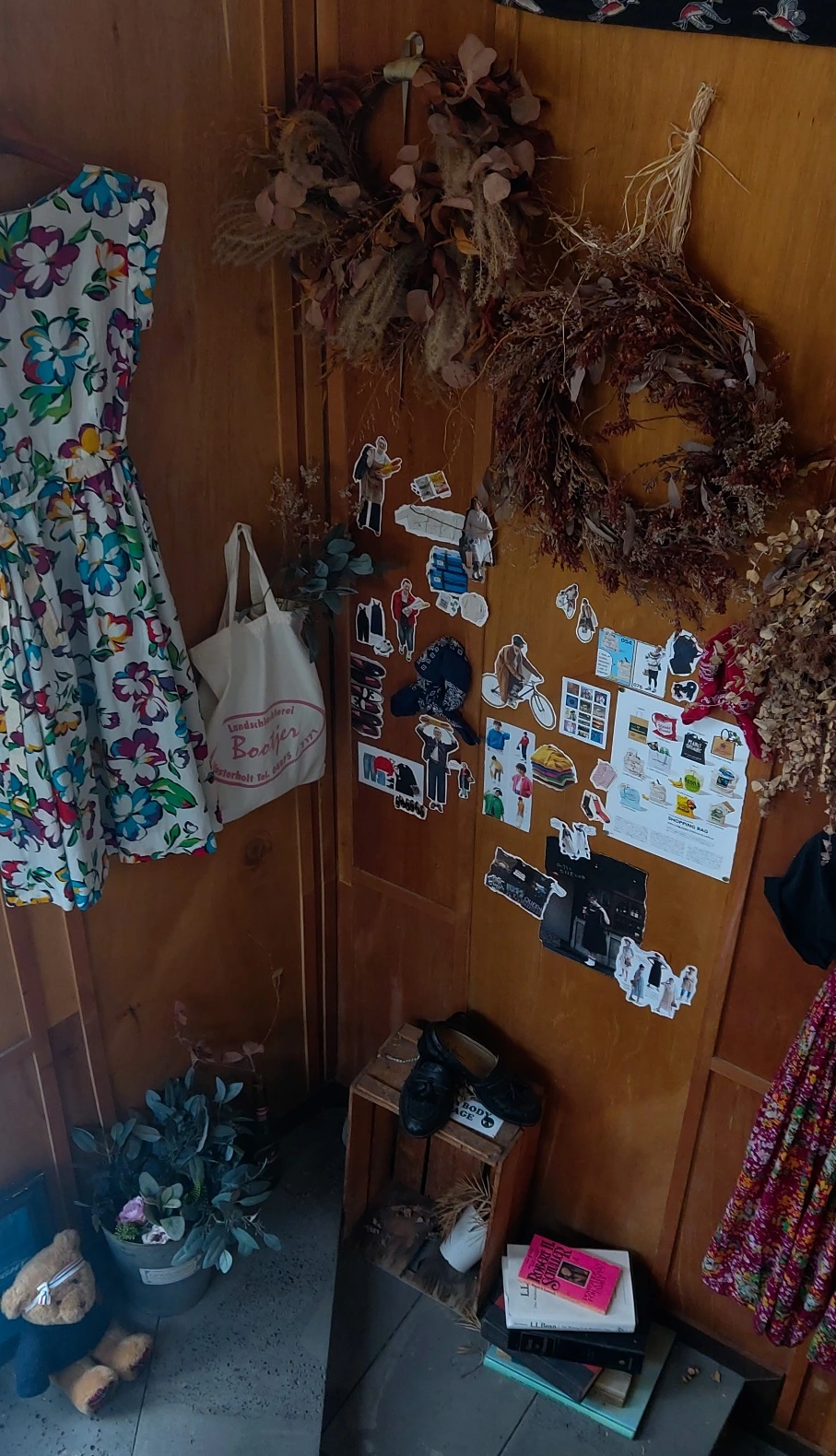 우리는 영화의 거리 안에 있는 구제의류샵에 들어갔다. 좁은 계단을 빙빙 돌아 올라가면서 보이는 스티커와 소품들을 보는 재미가 있었다. 마침 그날은 반팔티 할인행사를 진행 중이었다. 해외 스포츠팀 로고가 그려진 프린팅 티셔츠들이 수백 장이었다. 구제옷 구경은 언제나 재미있다. 유행이 만들어졌다가 몇 년 뒤 구닥다리 취급받고 또 몇 년 뒤에는 길거리에서 발에 차이듯 많아지는 흐름이 눈에 보인다. 이다음으로 갔던 곳은 이름답게 길모퉁이에 있고, 두 명이 나란히 걸을 수 없을 만큼 좁다란 공간이었는데, 그 안에 의류와 잡화가 옥수수알처럼 빼곡히 걸려 있었다. 이런 재미있는 공간들을 둘러보다 보니 계획 없는 오후가 잘만 흘러갔다.
