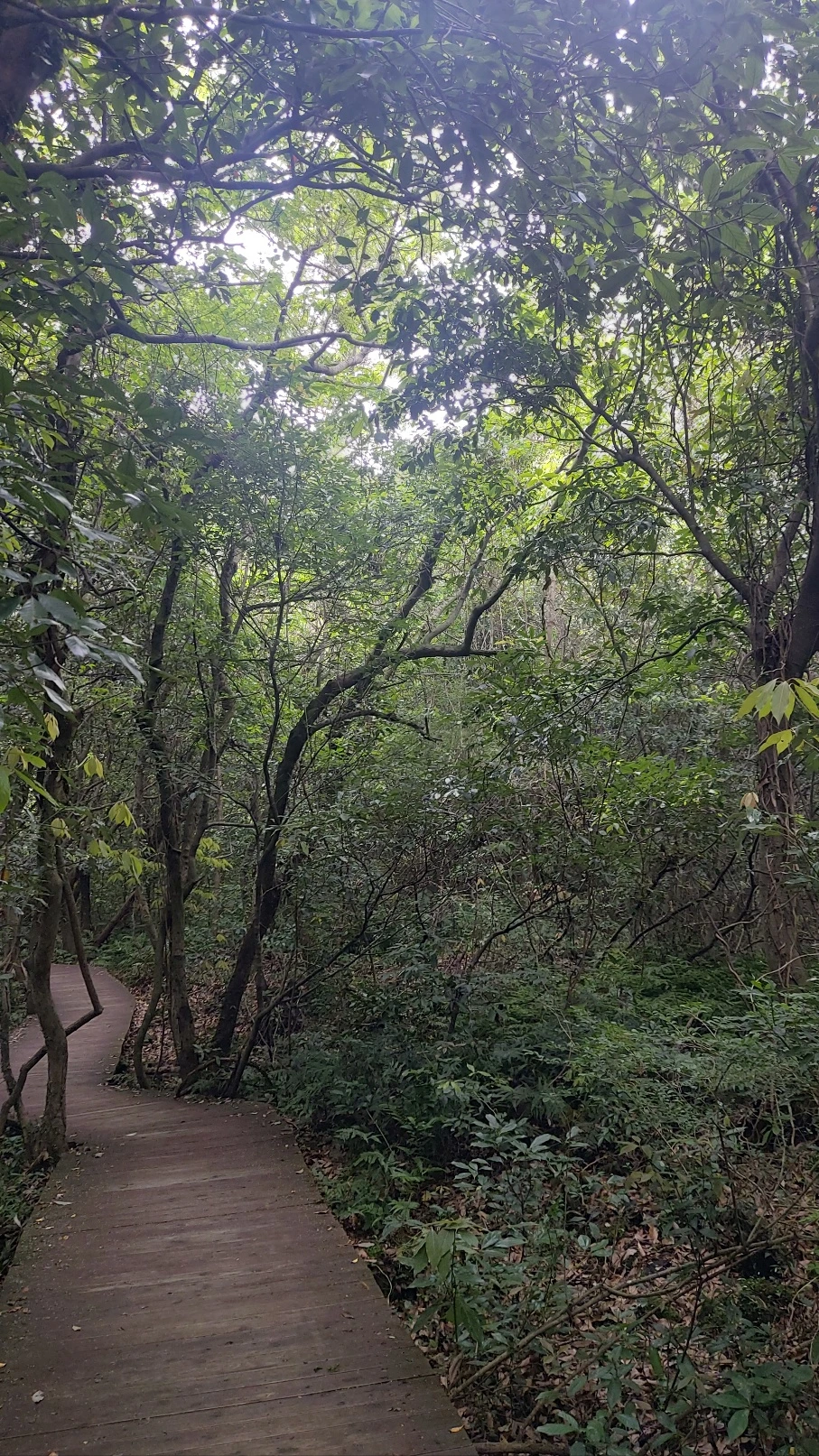 곶자왈 도립공원에는 여러 개의 코스가 있어 난이도와 시간을 보고 코스를 정할 수 있다. 우리는 가장 짧고 쉬운 코스인 테우리길을 지나 전망대를 구경하고 돌아오기로 했다. 최약체 코스답게 데크가 깔려 있어 어지간한 오르막에도 걷기가 쉬웠다. 무엇보다 어스름한 그늘 아래서 빽빽한 나무들의 습기와 바람을 느끼면서 걷는 게 정말 기분 좋았다. 나무마다 이름표가 달려 있고 중간중간 곶자왈과 제주도의 환경과 관련된 퀴즈까지 붙어 있었다. 우리는 현장학습 온 초등학생들보다 신이 나서 전망대까지 걸음을 옮겼다.
