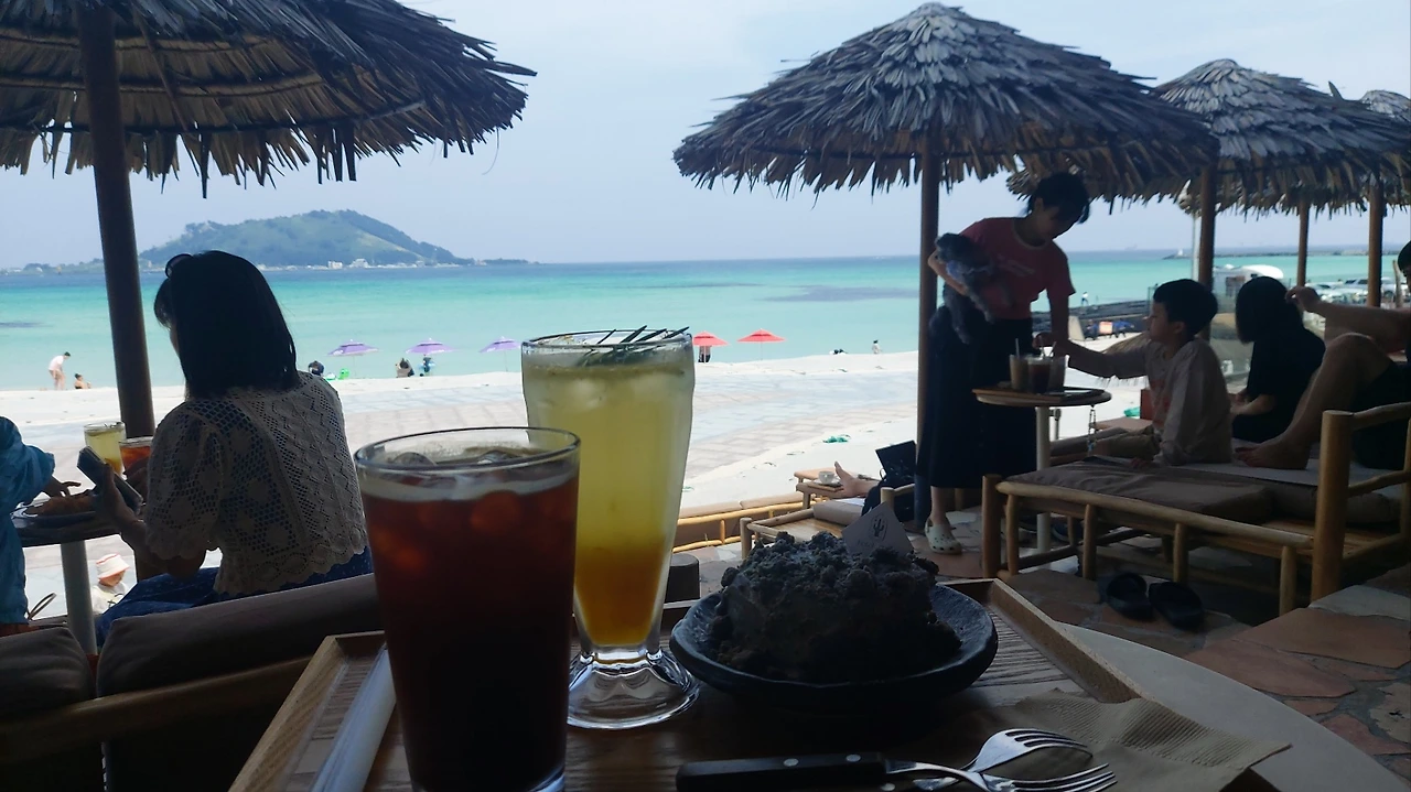 떠나고 싶지 않은 숙소를 뒤로 하고 아침을 먹으러 나왔다. 제주도에서의 마지막 아침은 숙소 앞 카페에서 먹기로 했다. 호텔인 줄 알고 지나쳤던 문 안으로 들어가니 해변과 맞닿은 근사한 테라스와 하나씩 전부 먹어보고 싶은 디저트가 우리를 반겼다. 그중 우리가 선택한 건 흑임자 맛이 나는 화산섬 모양 케이크였다. 그늘에서 아침 바닷바람을 맞으며 먹는 케이크와 커피는 어디서도 비교하지 못할 맛이었다. 접시가 비어갈 때쯤 우리는 잠시 일어나 바닷가로 갔다. 여행 중 비는 한 방울도 떨어지지 않았고 이날의 날씨마저 환상적이었다. 잊지 못할 여행이다. 다음번에 제주도로 돌아온다면 그 이유에는 분명 이날의 기억이 있을 것이다.