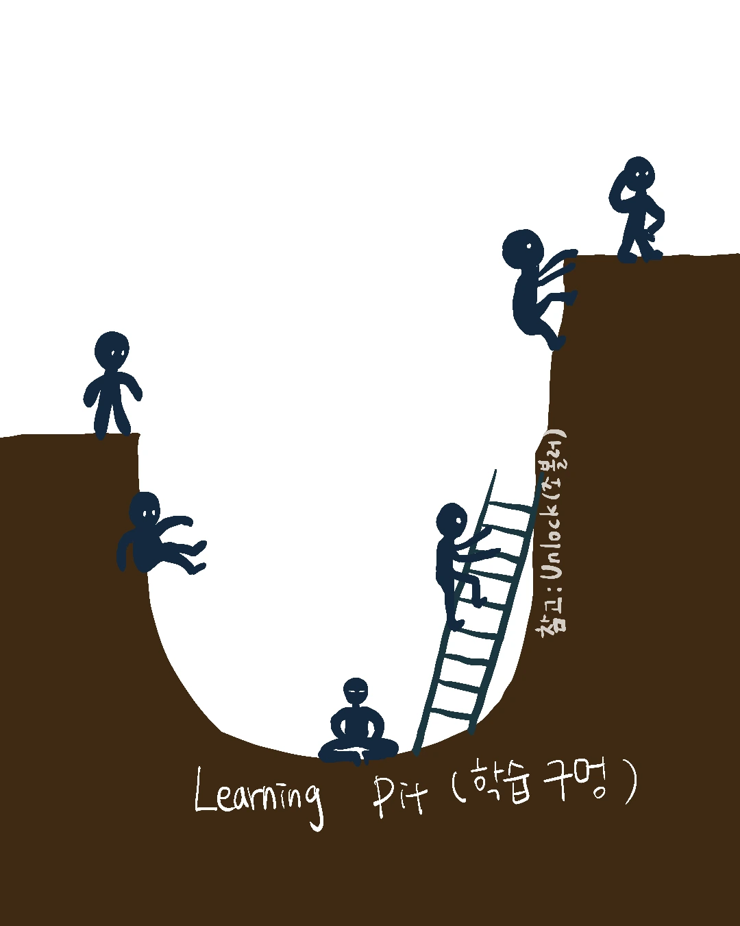 실패도 마찬가지다. 학습의 과정이 계단식이 아니라, 학습 구멍이라고 하는 learning pit이라고 생각한다면 나의 매순간의 실패가 두렵지 않아진다. 그저 어제보다 더 나은 내가 되기 위해 잠시 구덩이 속에 스스로 들어가 깊이 고민해보고 더 높이 올라갈 전략을 짠다고 생각하면 되지 않을까?