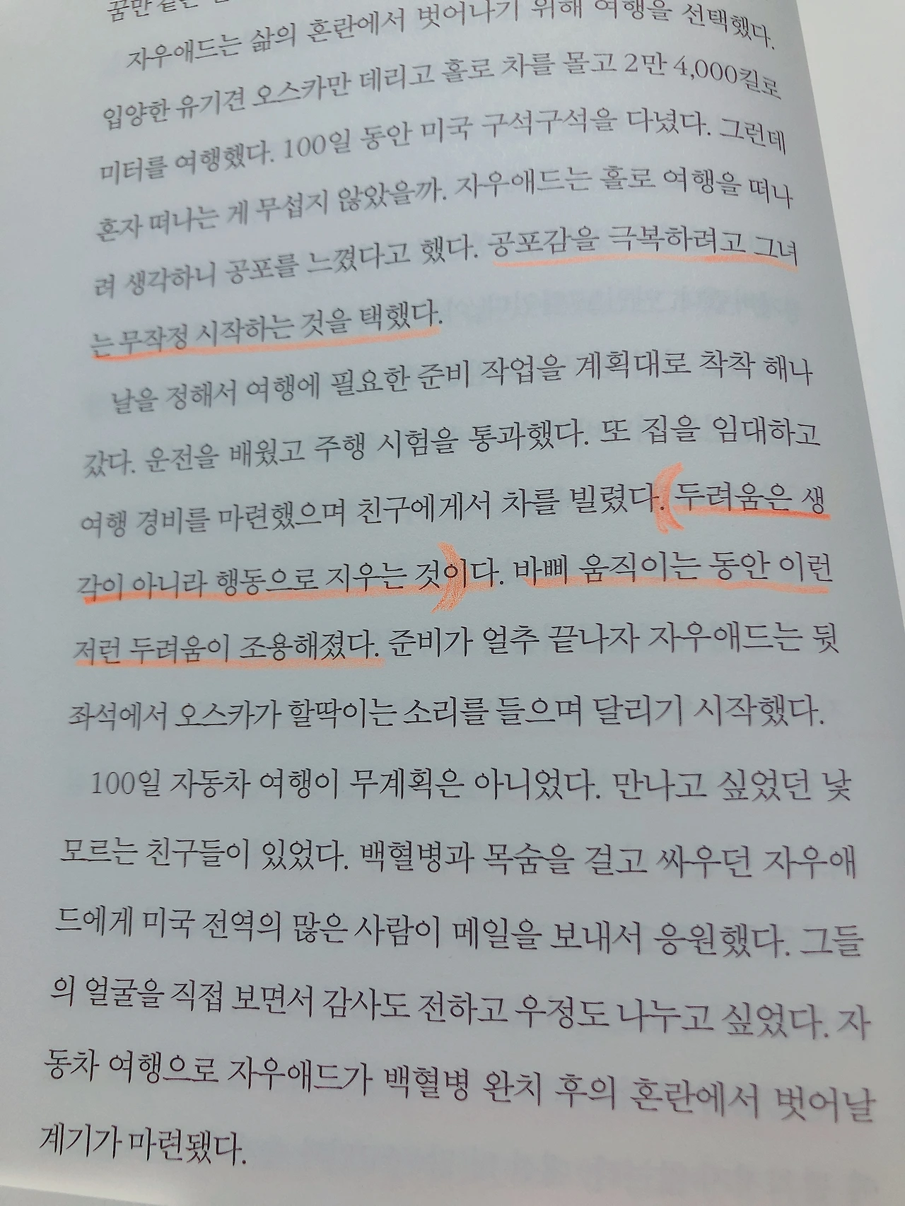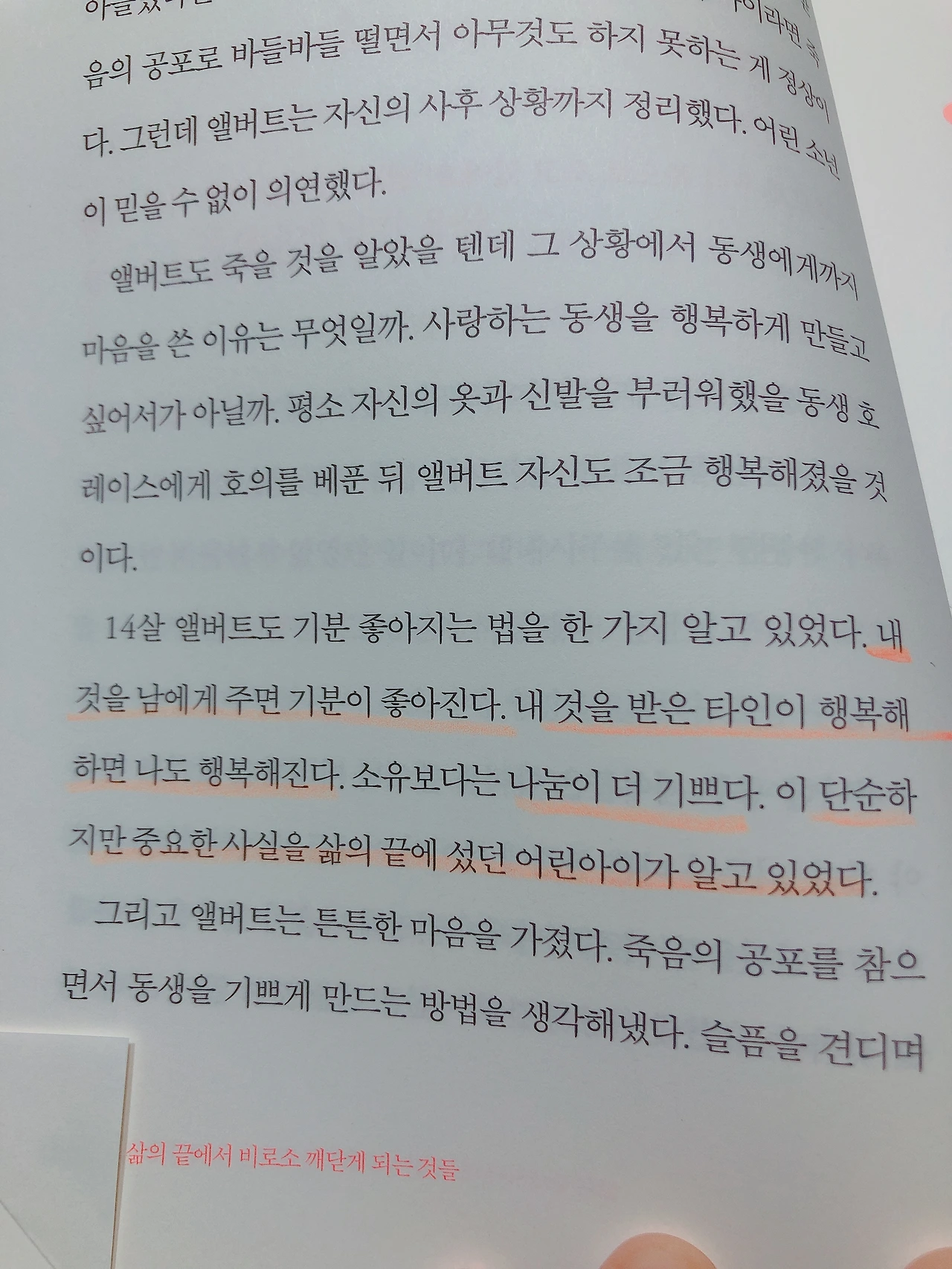 '두려움은 생각이 아니라 행동으로 지우는 것이다.' 이 부분을 읽고 심장이 마구 뛰었다. 내가 작년부터 매일 새벽 달리기를 하면서 느꼈던 감정이었다. 죽음의 공포에서 두려움으로 아무 행동도 못할 것만 같던 소녀는 무작정 행동에 옮기는 것으로 그 두려움을 지웠다. 이 책의 좋은 점은 200여 편의 유서나 회고담을 참고했기 때문에 여러 사례를 비교할 수 있다는 것이다. 죽음을 앞뒀다고 누구나 갑자기 현인이 되지도 않고, 그렇다고 모든 이가 무기력해지지도 않는다. 행복해 보이는데도 그 누구보다도 괴로워한 사람의 모습도 볼 수 있고 나라면 엄두도 안나는 역경 앞에서 이겨낸 사람의 이야기도 엿볼 수 있다.