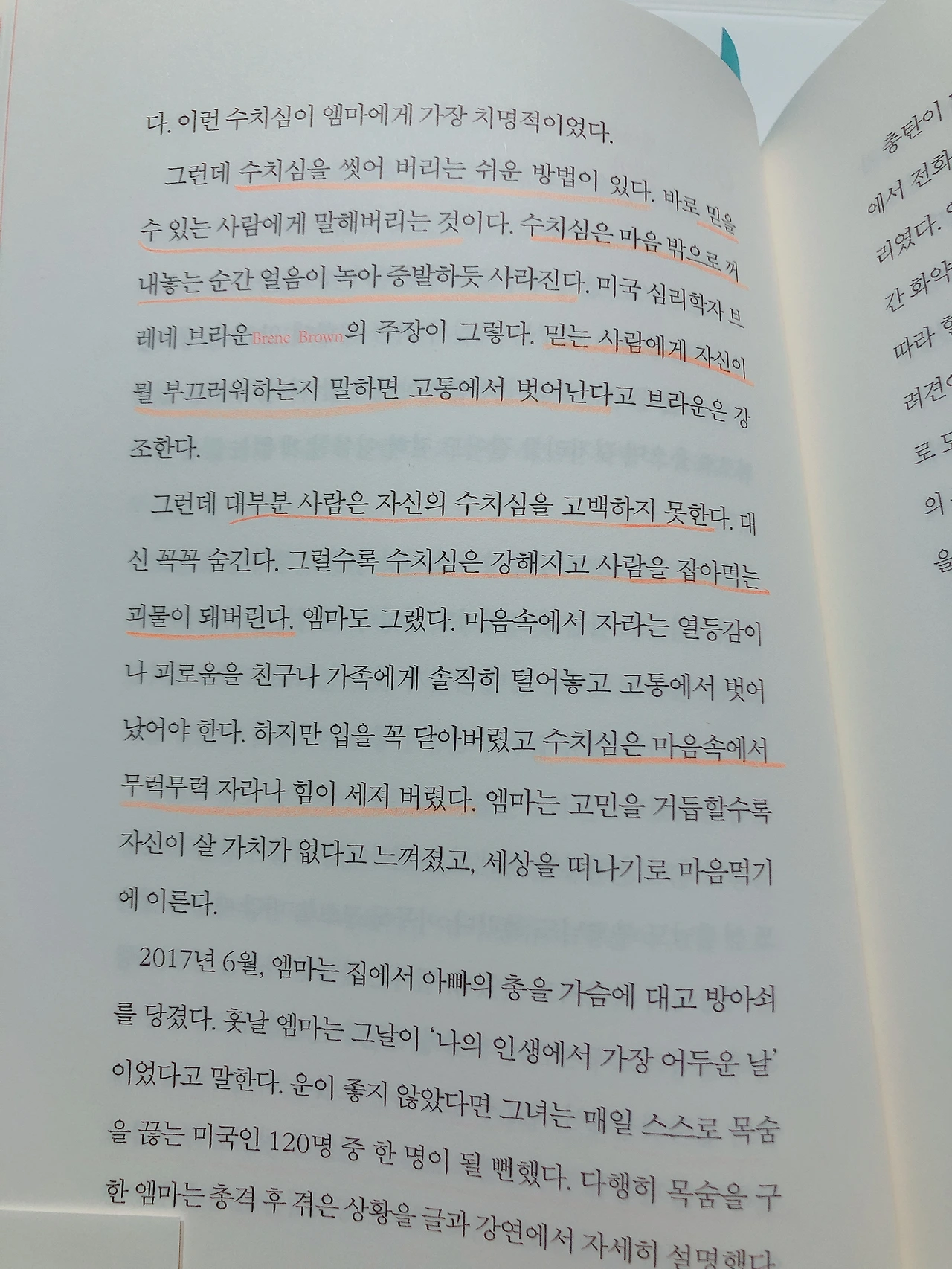 사람을 가장 고통스럽게 만드는 것들에 대한 이야기도 나온다. 그리고 믿을 수 있는 사람, 자신의 깊은 속이야기까지 터놓을 수 있는 사람이 존재한다는 것만으로도 감사함을 느끼게 된다. 수치심을 드러낸다는 게 고통스럽고 두려울 수 있지만 이 소중하고 아름다운 삶을 저버릴 만큼은 아니다.