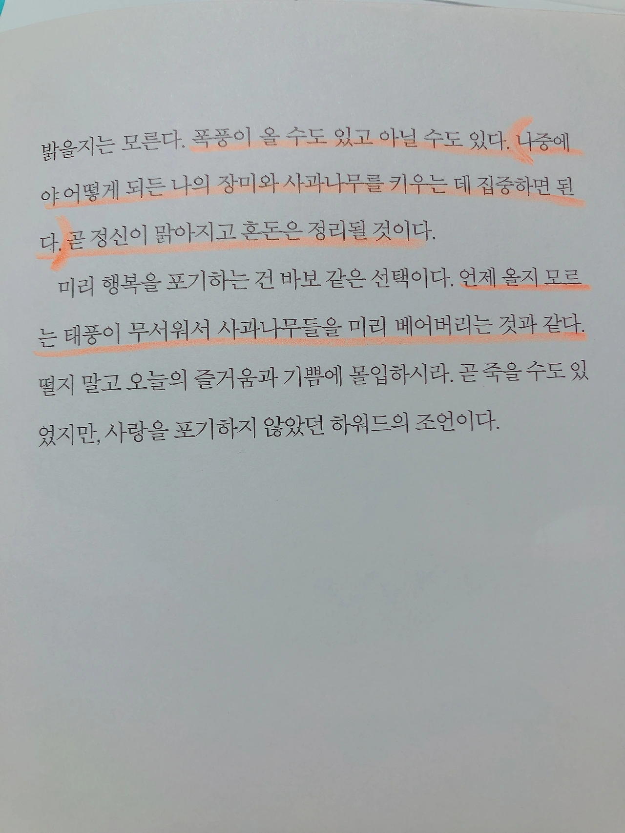 나는 항상 두려워하고 미래에 대한 걱정이 많았던 아이였다. 하지만 책을 읽고 읽은 것을 바탕으로 조금씩 행동으로 옮기고, 그리고 매일 달리기와 글쓰기, 좋은 사람들과 연결되면서 나의 삶은 바뀌었다. 나의 장미와 사과나무를 키우는 데 집중하기로 마음먹은 것이다. 그 어느 때보다도 신나고 즐겁게! 미리 행복을 포기하고 태풍이 올까 봐 발만 동동 구르는 짓은 더 이상 하지 않겠다 마음먹었다. 두려움에 무릎 꿇고 나의 사과나무를 베어버리는 일 따위는 하지 않을 거다.