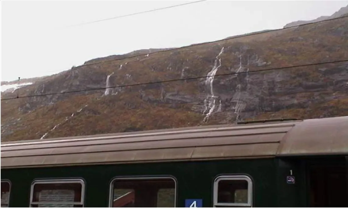 폭포와 같은 물이 흘러내리는 곳에서 열차가 잠시 정차한다.