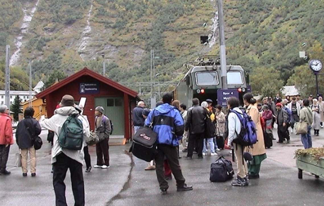<피요르드 관광을 하기 위한 기차표 예매를 위해 줄을 서 있다>
