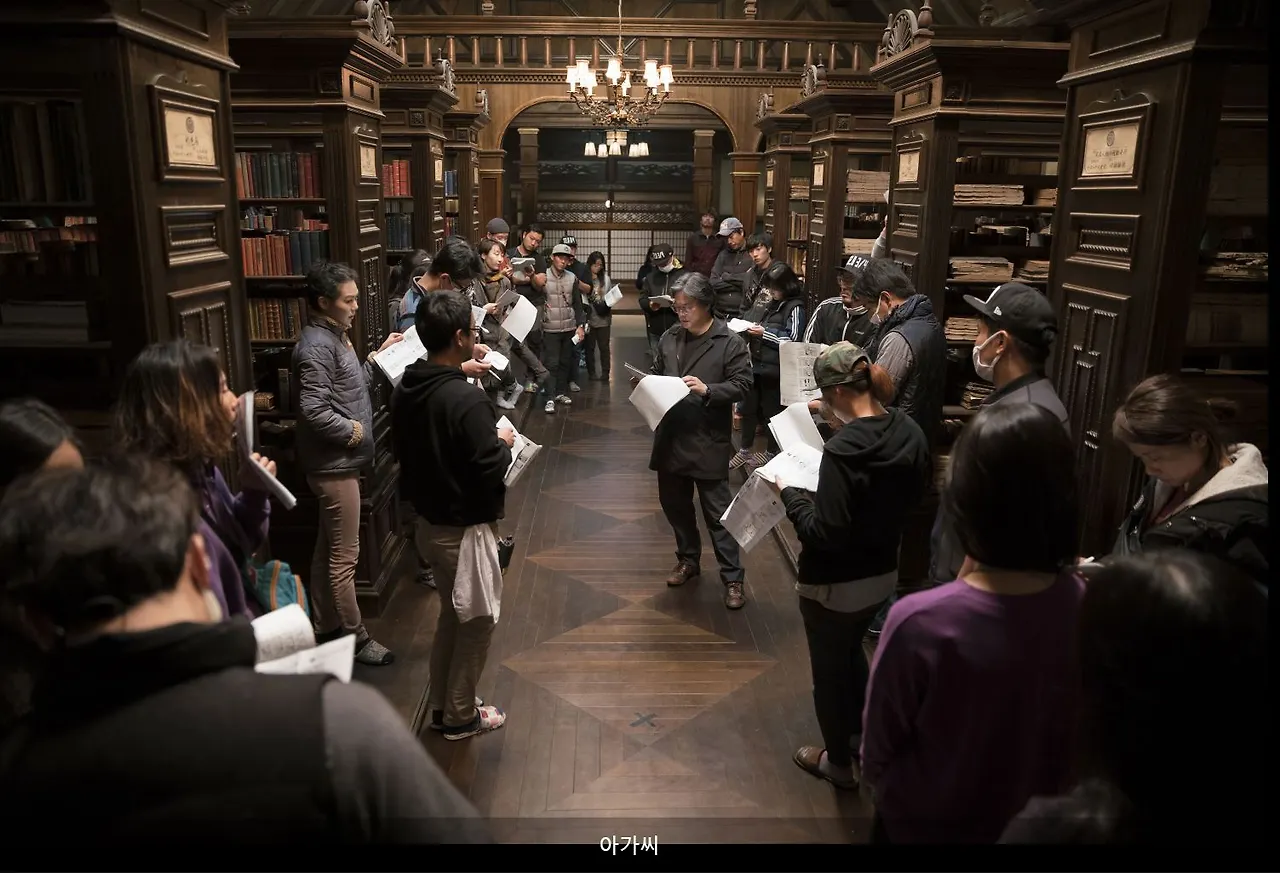 ‘낭독회’란 모임은 특이하다. 음란한 내용을 점잖은 양복을 입고서 모두가 긴장된 표정으로 지켜보며 섹스적인 상상 속으로 빠져든다. 그리고 겹겹의 기모노를 껴입은 이모 ‘히데코’와 거리를 두고 일체의 행동은 하지 않는다. 마치 핀란드의 한 섹스숍처럼 말이다. 오직 음란성은 언어로만 전달되고 책 속의 그림으로만 보여주고 상상 그 자체로 이루어진다.