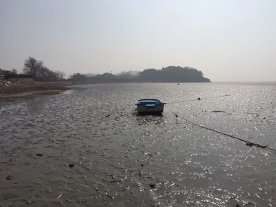 갯벌에 잡힌 조각배 하나 외로이 멈춰 서있다
