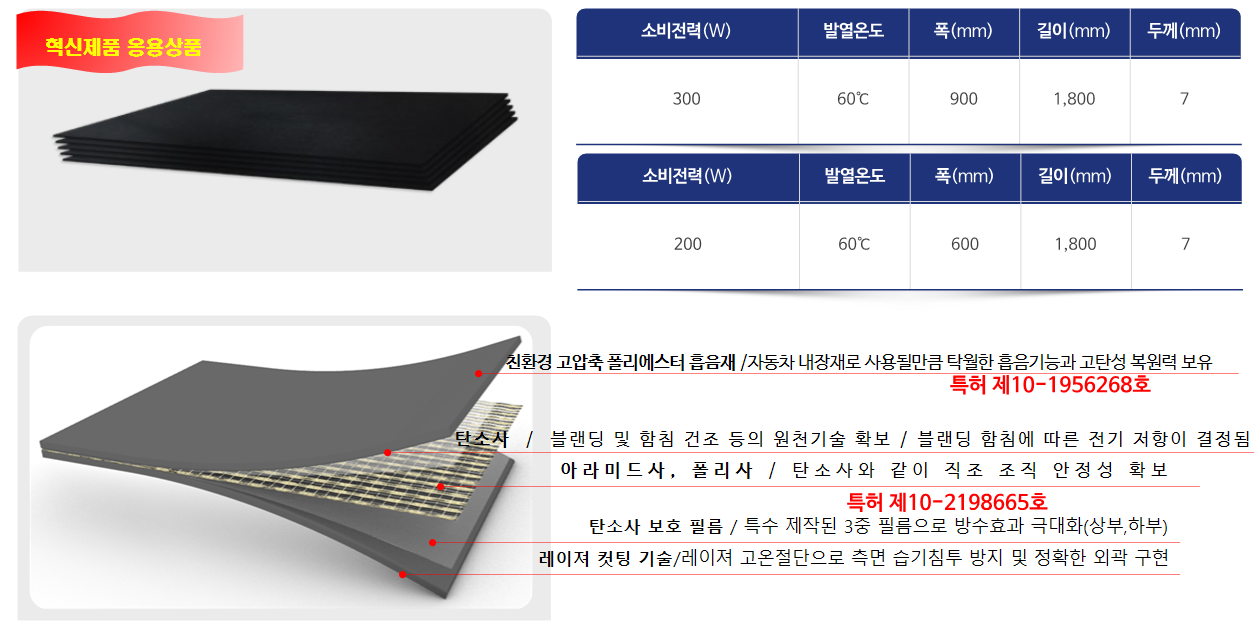 또 현장 시공비가 저렴하고 발열 전도성이 60도까지 유지할 수 있어 경제적이고, 전자파 역시 정부 허용기준치에 미달한다. 이번에 출시된 제품은 두께 5mm 제품으로 가로 90mm 세로 1,800mm이가 있다.