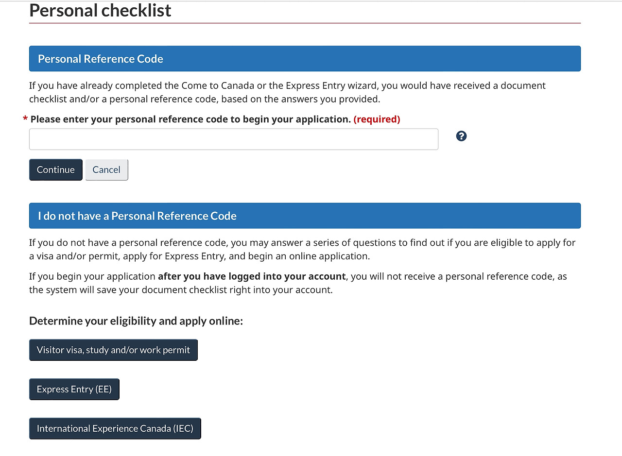 Personal Reference Code (PRC)는 모든 첫번째 과정을 마치고 결제만 남겨둔 사람들이 받는 코드이다. 처음 신청하는 사람들은 PRC가 없으니 그 밑에 있는 [Visitor visa, study and/or work permit] 칸을 눌러주자.