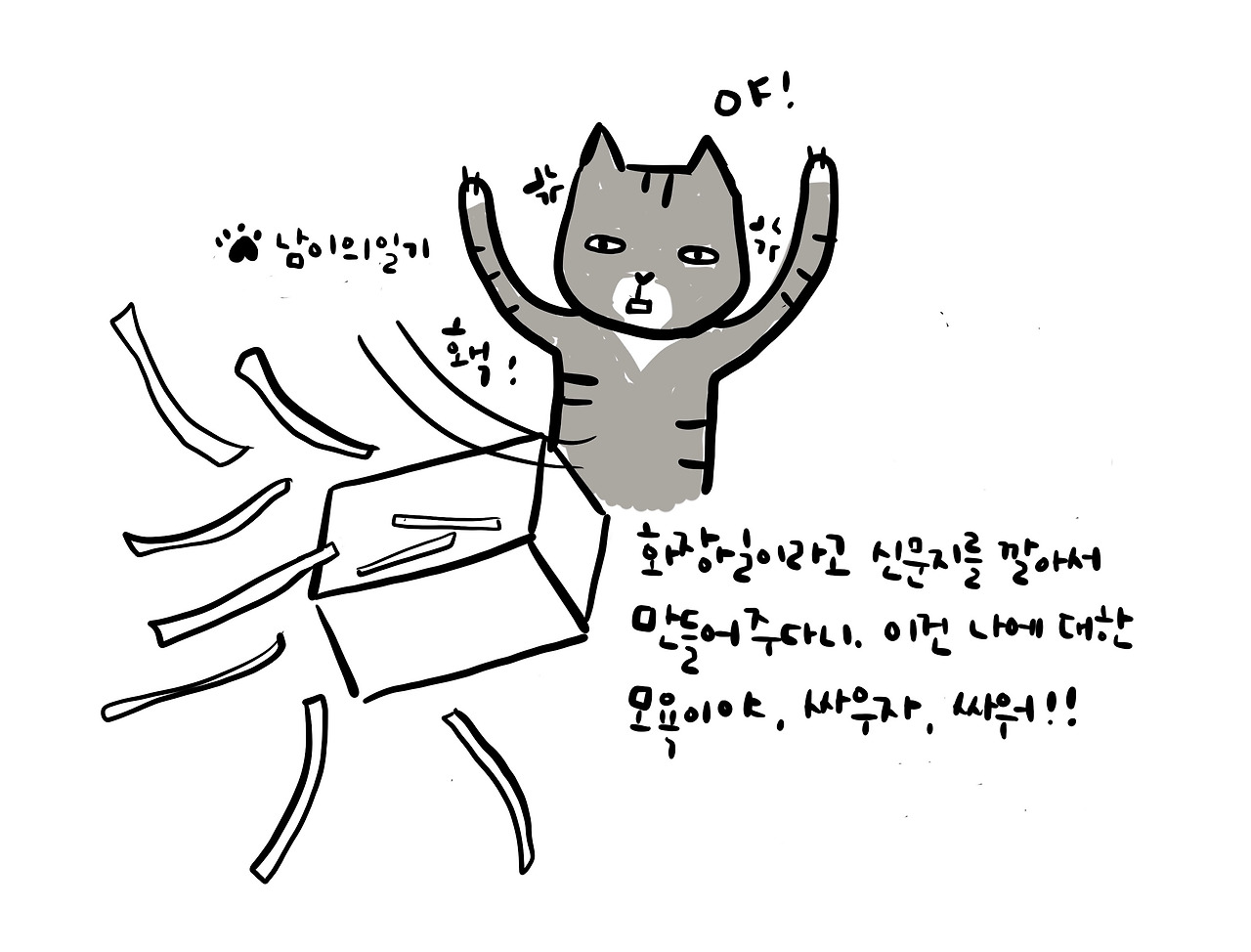 병원에서 데려온 새끼고양이는 케이지에서 꼼짝도 하지 않았다. 일단 그사이에 임시화장실을 만들었다. 모래 대신 집 주변의 무가지 신문을 모아 죽죽 찢어서 박스에 깔아서. 지금은 그때 내가 얼마나 어리석은지 그때의 나에게 뛰어가 멱살을 잡고 정신 차리라고 흔들고 싶은 심정이지만, 그때는 정말 그걸로 될 줄 알았다. 토끼를 키울 때, 개를 키울 때 그랬으니까. 하지만 남이는 토끼도 개도 아니었다, 무려 고양이’님'이시기에 이 새끼고양이는 신문지 화장실을 거들떠보지 않았다.