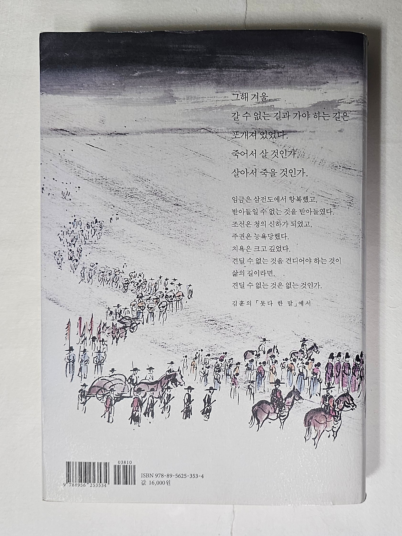 책을 덮자, 긴 행렬이 다시 보인다. 앞표지와 이어봤던 남한산성으로 향하던 긴 행렬이 아니다. 뒤표지만 보자 그 행렬은 청으로 향하고 있다. 볼모로 잡혀가는 소현세자와 봉림대군, 돌아와 환향녀라 손가락질받던 공녀들 그리고 포로가 된 이름을 알 수 없는 수많은 백성이 행렬을 메우고 있다. 남한산성에서 벌인 전장의 말은 추상(抽象)이었다. 백성들은 말의 추상을 육화하여 오랜 시간 이렇게 모욕의 길을 걸어갔다. 에필로그였다.