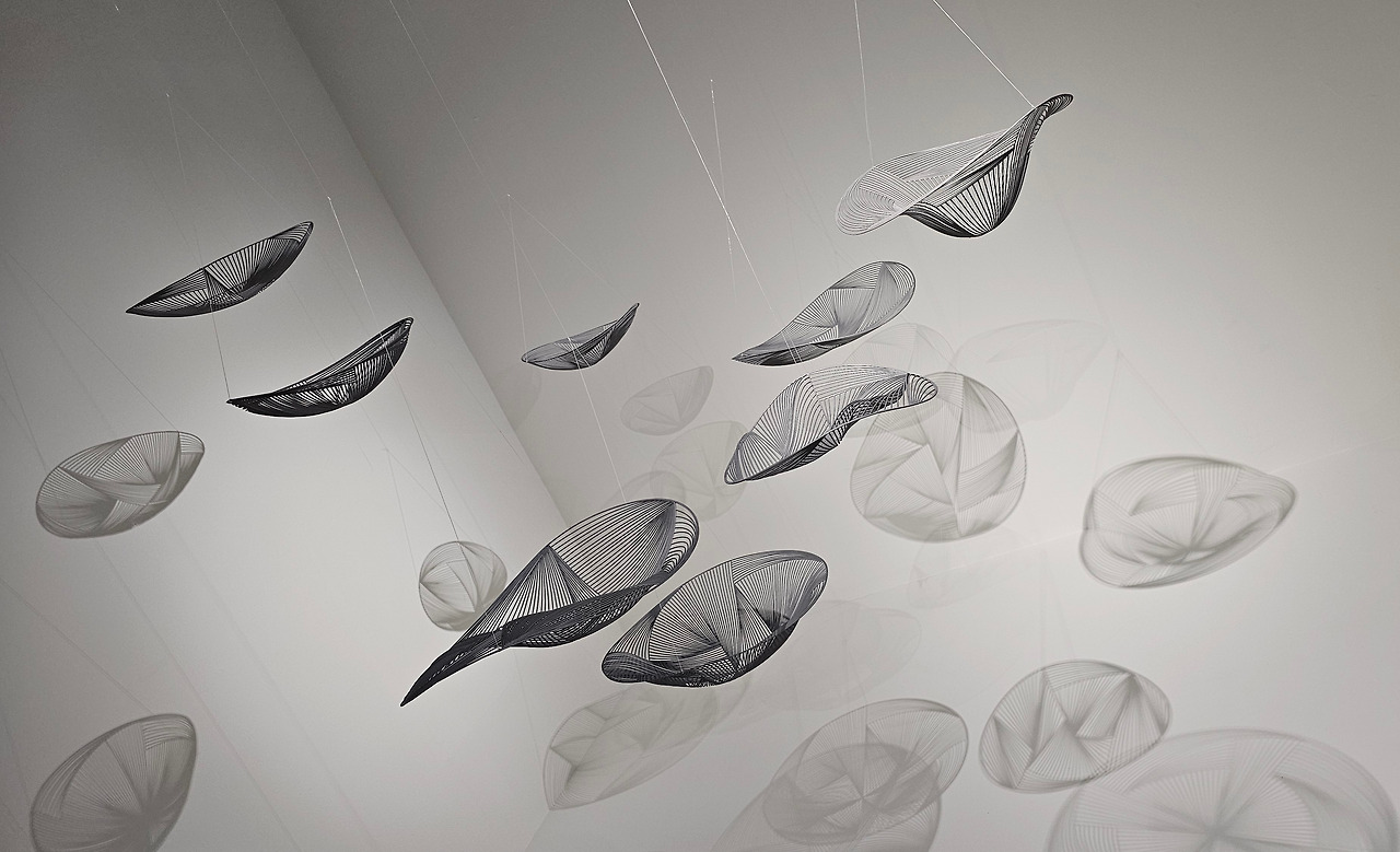 여기는 신화적인 공간일지 모른다. 얇은 금속 선들이 얼기설기 모여 면을 이루고 있다. 면은 곡선 형태를 취하고, 나비처럼 허공에 떠 있다. 조명에 의해 그림자가 하얀 바닥과 벽면에 또 다른 사물처럼 그려져 있다. 금속은 선이 되고, 선은 면이 되고, 면은 어떤 형태를 이루어 금속이 아닌 어떤 사물임을 드러내고 있다. 서울공예 박물관, 금속공예 기획전시인 <만년사물> 중 천우선 작가의 작품을 보는 순간, 공간은 다른 의미로 다가왔다. 박물관이 아니라 신화적 공간으로. 거듭되는 변화, 여기서도 변신을 본다.