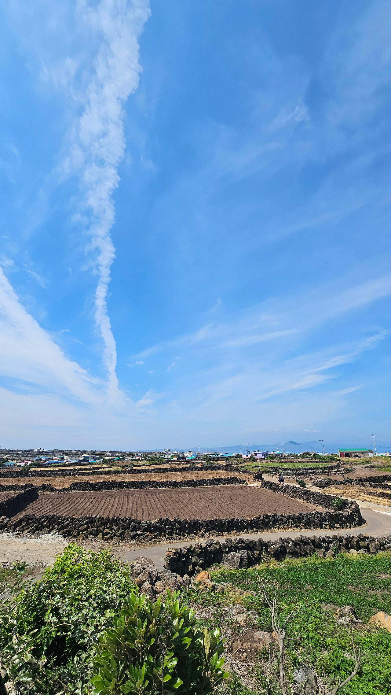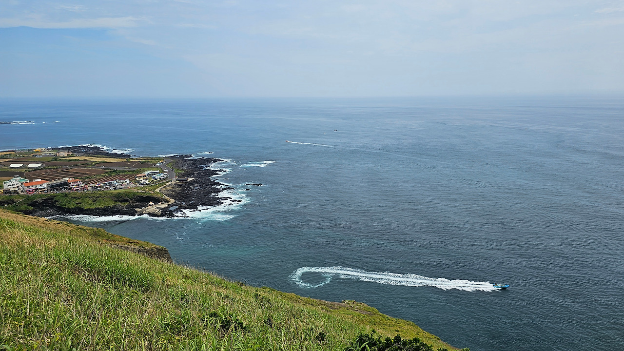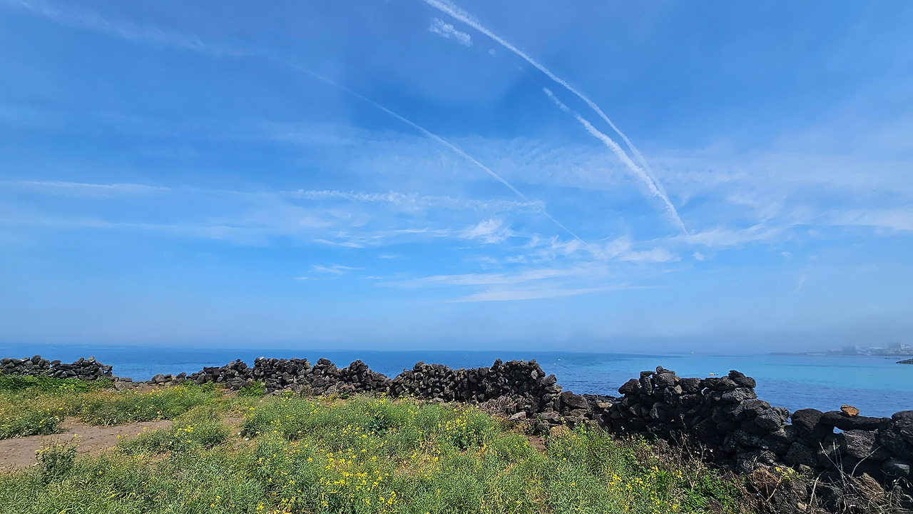 오르며 또 뒤돌아보았다. 우도 내륙의 전경이 서서히 드러났다. 직사각형의 우도저수지가 보이고, 그 너머로 마을, 바다 그리고 종달리에 있는 지미봉이 눈에 들어왔다. 능선에 도착하면 반대편은 바다로 떨어지는 절벽이다. 제주 말로 검은 모래라는 의미의 검멀레해변, 해변의 검은 바위에 부서져 더욱 대비되는 하얀 파도, 그리고 에메랄드빛 바다에 하얀 물결을 파내는 보트가 보인다. 내가 풍경 사진을 찍는 사이 부부가 올라왔다. 그들은 함께한 사진을 찍으려 했으나 힘들어했다. 결국 내가 찍어드렸다. 이들을 비양도 다리가 있는 아이스크림 가게가 아니라 콜드브루 가게가 있던 부근부터 보았던 것 같았다. 먼저 간 남자, 부부 그리고 나는 그곳에서부터 얼마간의 간격을 두고 걸었다. 그러나 누구도 서로에게 말을 걸지 않았다. 타인을 향한 침묵이 올레의 규칙처럼.