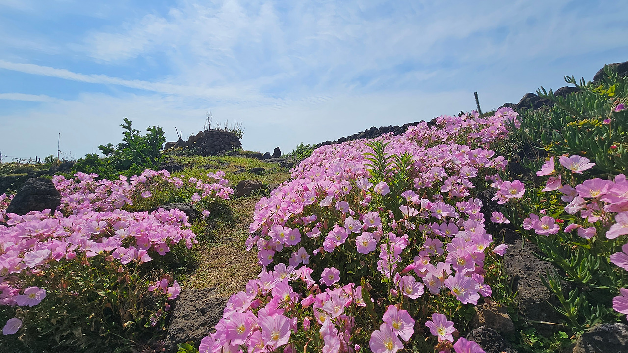 날이 맑다. 빛은 사물에 드리운 어제의 우울을 증발시켰다. 색들이 반짝반짝 빛난다. 파란 하늘을 물들이지 못한 에메랄드빛이 바다에 풀어져 있다. 녹색의 무거움이 에메랄드빛을 하늘로 번지지 못하게 한 것 같다. 파란 하늘에는 분필로 그은 듯 하얀 비행운들이 여러 굵기의 선으로 날고 있다. 길에는 검은 돌담을 뒤덮고 있는 분홍 꽃이 군락을 이루며 피어 있다. 낮달맞이꽃이다. 달맞이꽃은 밤에 피는데, 낮에 피기에 낮달맞이꽃이라 이름을 붙인 것 같다. 꽃에는 한 여인의 사랑이 스며있다. 여인은 사랑하는 사람과 평생 있게 해달라고 빌었다. 소원은 이루어지지 않았고 슬퍼하다 죽었다. 그녀가 매번 소원을 빌었던 곳에 이 꽃이 피었다. 무언의 사랑, 보이지 않는 사랑이 꽃말이다. 비극적 서사지만 오랜 시간에 단련된 듯 그녀의 꽃은 원숙한 미소로 피어있다.
