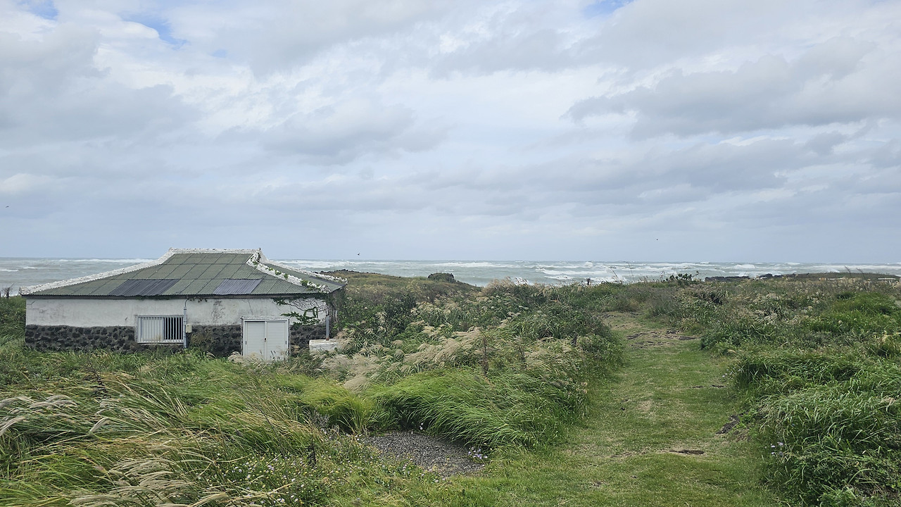중간스탬프가 있는 행원포구까지 숲과 밭의 긴 길이 그리고 짧은 마을 길이 이어졌다. 마을 길은 해안 도로와 만나 곧장 행원 포구로 가지 않고 바닷가 길을 돌아 행원 포구에 닿았다. 도로에서 카페가 있는 길로 빠져 바닷가로 걸어가면 쓸쓸한 초록 사구와 만난다. 그 너머에 여전히 파도를 몰고 오는 회색 바다가 있다. 이 풍경은 왠지 익숙했다. 어떤 영화의 엔딩이 떠올랐다. 독일 영화 ‘노킹 온 헤븐스 도어’였다. 두 남자가 초록의 사구 사이로 난 길을 걷고 있는 장면이었다. 골수암 말기의 루디와 뇌종양 진단을 받은 마틴은 같은 병실에 입원하고, 단 한 번도 바다를 보지 못한 루디를 위해 마틴은 그와 함께 병원에서 탈출한다. 우여곡절 끝에 도착한 바다에서 둘은 바다를 보고, 마틴은 루디 곁에서 쓰러져 죽는다. 강풀 작가의 ‘당신의 모든 순간’에서도 좀비의 세상에서 주광철은 바다를 보고 싶어 하는 부인 홍술녀를 휠체어에 태우고 걸어서 바다로 향한다. 화진 해수욕장에 도착한 그들은 그대로 바다로 들어간다. 생의 마지막을 위해 이들은 왜 바다로 갔을까?