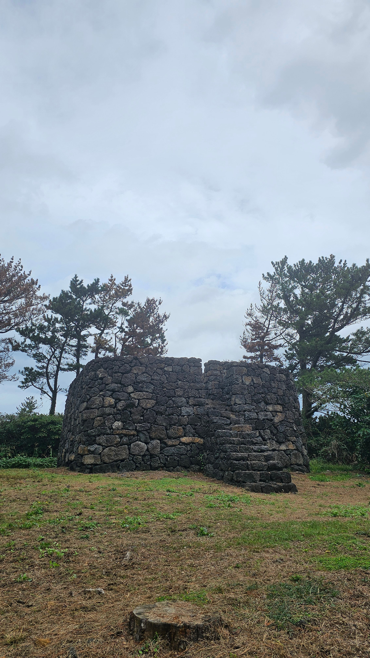 물 폭탄 이후, 마음을 가다듬고 평정심을 유지하며 걸었다. 젖은 옷은 신경 쓰지 않았다. 걷다 보면 마르겠지 생각했다. 길은 밭과 나무들이 있는 숲길이었고 좌가연대에서 거의 170도 각도로 급격히 꺾였다. 꺾이는 꼭짓점에 있는 좌가연대는 검은 현무암으로 쌓아 올린 육면체로, 정면에서 안으로 들어갈 수 있었다. 좌가연대에 대한 안내문을 읽고 연대와 봉수의 차이를 알게 되었다.