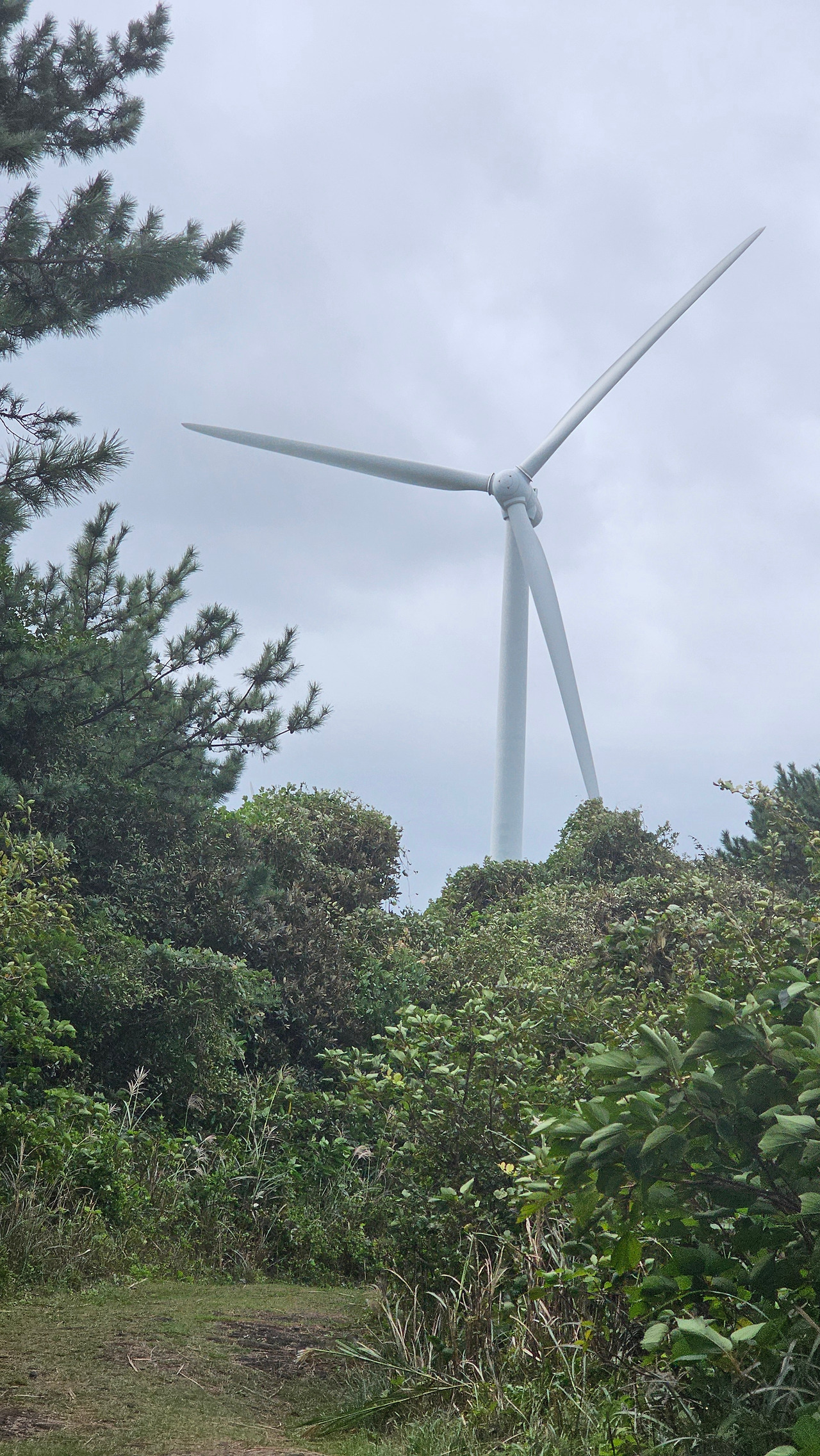 좌가연대에서 급히 꺾인 길을 걸으면 두 가지가 눈에 띈다. 하나는 풍력발전기이고 다른 하나는 작은 표지목들이다. 풍력발전기는 좌가연대 이전부터 우뚝 솟은 기둥과 함께 거대한 날개가 나무들 위로 보였다. 그리고 좌가연대를 지나면서 그 거대한 실체를 고개를 들면 볼 수 있었다. 풍력발전기 근처에 다가가면 ‘웅웅’ 소리가 났다. 처음에는 바다로부터 불어오는 바람 소리라고 생각했다. 사실 해풍은 지상의 많은 소리를 지웠다. 특히 저번 올레에서 어디서나 들었던 새소리가 사라졌다. 새들은 해풍을 피해 더 깊은 내륙으로 날아간 것 같았다. 바람은 자신의 소리로 이런 소리의 공백을 메웠다. 그것은 바람이 공간을 가로지르며 내는 ‘쏴쏴’ 소리이거나 나무들을 비정하게 흔들며 내는 ‘쉬쉬’ 소리였다. 그런데 숲길로 들어서면서 갑자기 바람 소리가 사라졌다. 진공의 공간처럼 어떤 소리도 없었다. 묘한 느낌이 들었다. 바람 소리뿐만 아니라 일상의 다른 소리도 입국을 허락하지 않은, 모든 소리를 거부하는 중립국 같았다. 그러나 얼마쯤 걸으니, 소리가 다시 서서히 들리기 시작했다. 바람 소리라 생각했다. 바람이 숲의 우듬지를 흩고 지나가는 소리라고 생각했다. 그러나 자세히 들으니 ‘쉬쉬’하는 바람 소리하고는 미세하게 달랐다. ‘웅웅’으로 들렸다. 더 걸으니, 소리는 커지기보단 무거워져 가는 느낌이었다. 바람이 내는 조금은 가벼운 소리와는 확연히 다른 소리였다. 고개를 드니 거대한 풍력발전기가 보였고, 그곳으로 다가갈수록 소리는‘웅웅’에 무게를 더한 것처럼 더 무거운 소리가 났다. 거대한 풍력발전기의 프로펠러가 힘겹게 돌아가는 소리였다. 묵직한 인공적인 소리였다. 풍력발전기는 19코스 동복리 마을 운동장으로 가는 산길에서도 종종 볼 수 있었다. 그리고 프로펠러가 돌아가면 어김없이 웅웅 소리가 났다.
