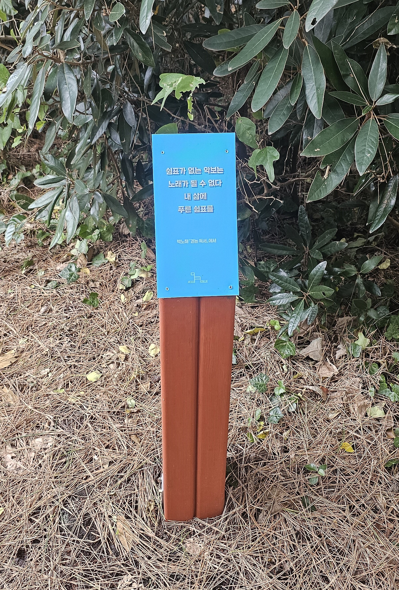 다른 하나는 나무로 만든 작은 표지목인데 위에 있는 파란색 판에 글귀가 적혀 있었다. 이것은 19코스 중간스탬프가 있는 동복리 마을 운동장에 이르는 산길 곳곳에도 보였다. 주로 숲길이나 산길에 있었다. 글귀는 박노해 시인의 <걷는 독서>라는 책에서 가져왔다. 이곳에는 세 개가 있었다. 서둘지 마라. 그러나 쉬지도 마라. 위대한 것은 다 자신만의 때가 있으니 / 쉼표가 없는 악보는 노래가 될 수 없다. 내 삶에 푸른 쉼표를 / 마음이 사무치면 꽃이 된다. 나머지 대부분은 19코스에 있다. 글을 음미하며 천천히 걸으라는 의미인 것 같았다. 그러나 난 한 번 쓱 읽고 지나갔다. 내 마음은 급했고 여유가 없었다. 너무 긴 코스를 이어서 걸어야 했기 때문이었다. 과연 해가 지기 전에 도착할 수 있을지 자신이 없었다. 그래서 ‘쉼표가 없는 악보는 노래가 될 수 없다. 내 삶에 푸른 쉼표를’이라는 글귀가 마음에 계속 남았다. 이렇게 전투적으로 걷는 것이 옳은 것인지? 올레의 취지에 어울리지 않는 이율배반적인 걷기를 하고 있는 것은 아닌지 계속 반문했다.