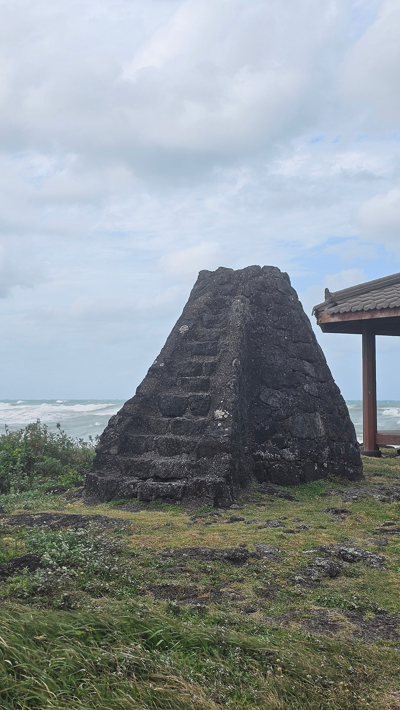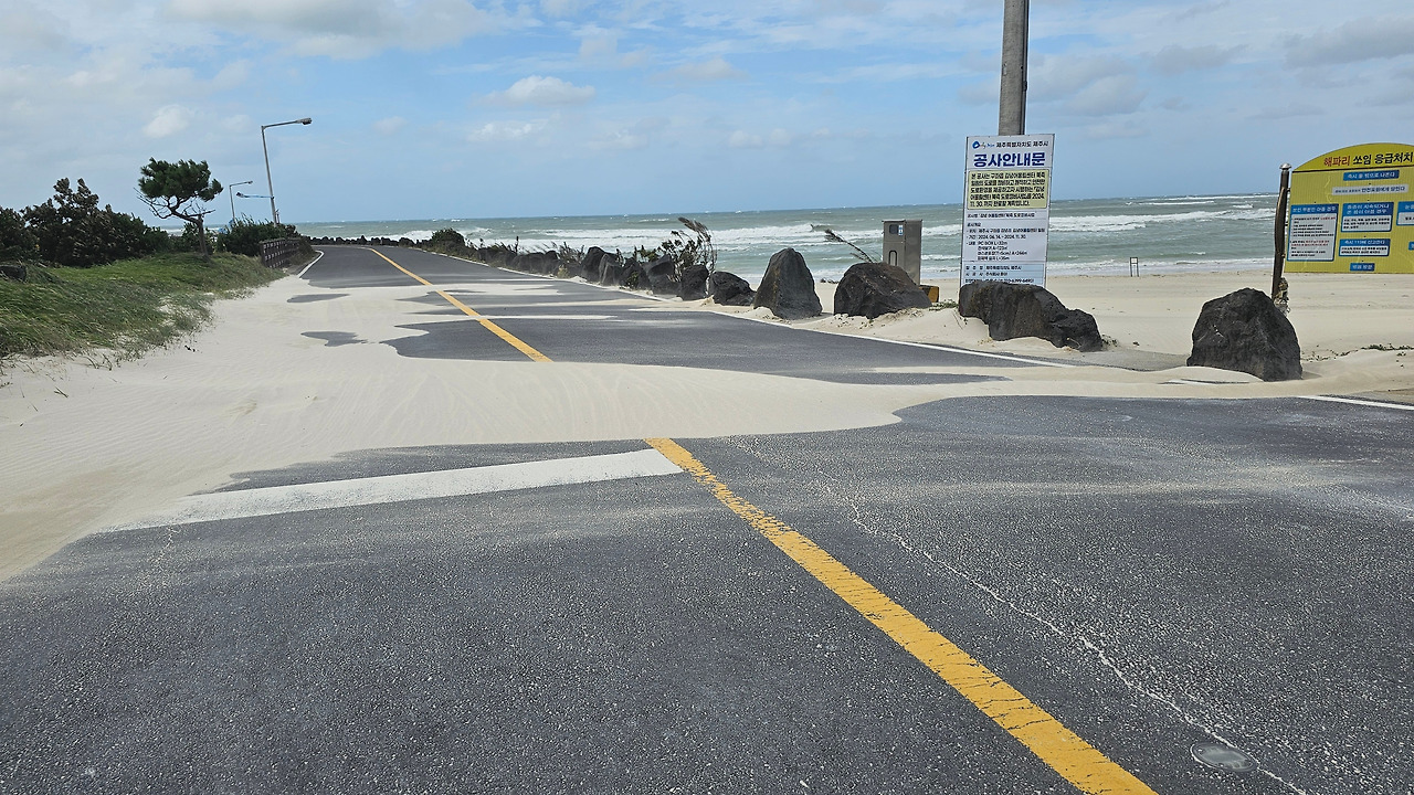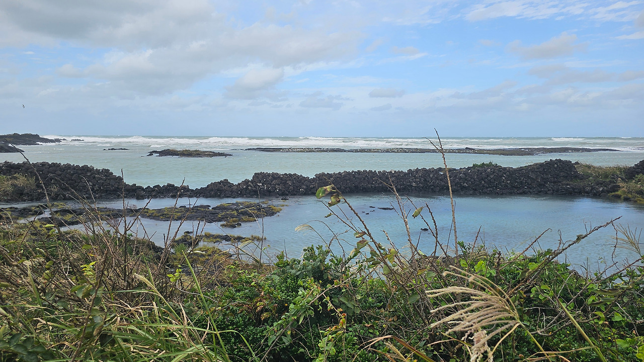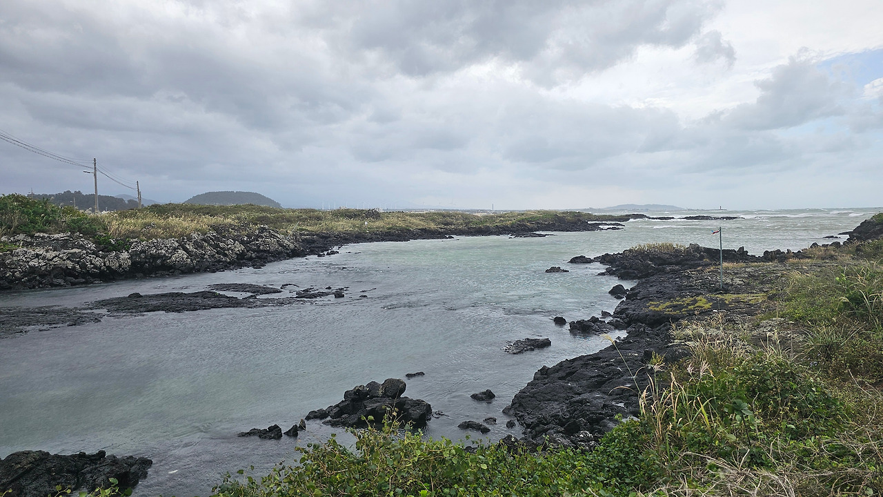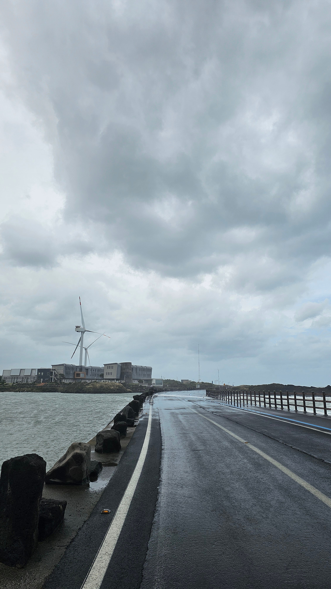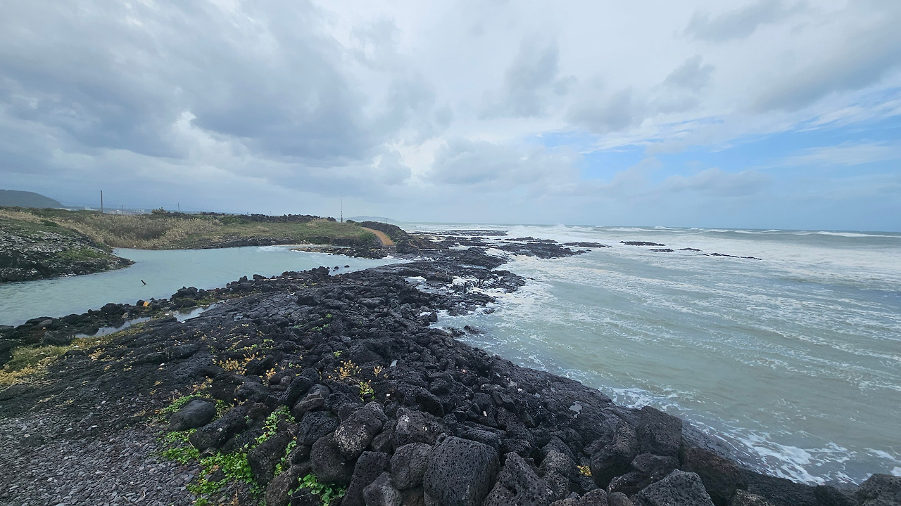 제주밭담 테마공원과 한국에너지 기술연구원 사이에는 바다가 내륙으로 들어온 작은 만이 있다. 해안도로는 이 만 위를 지난다. 거센 파도가 도로의 나무 난간으로 사정없이 들이쳤다. 부서진 나무 난간의 잔해가 도로 위에서 뒹굴었다. 뿐만 아니라 계속되는 파도로 인해 도로는 바닷물로 흥건했다. 차들은 파도가 치면 지나가지 않고 기다렸다 파도가 잠잠해지면 지나갔다. 지나는 차들로 인해 인도로 물보라가 일었다. 건너기가 엄두가 나지 않았다. 어쩔 수 없이 상황이 진정되기를 바라며 제주밭담 테마공원에 조성된 밭담을 둘러보았다.