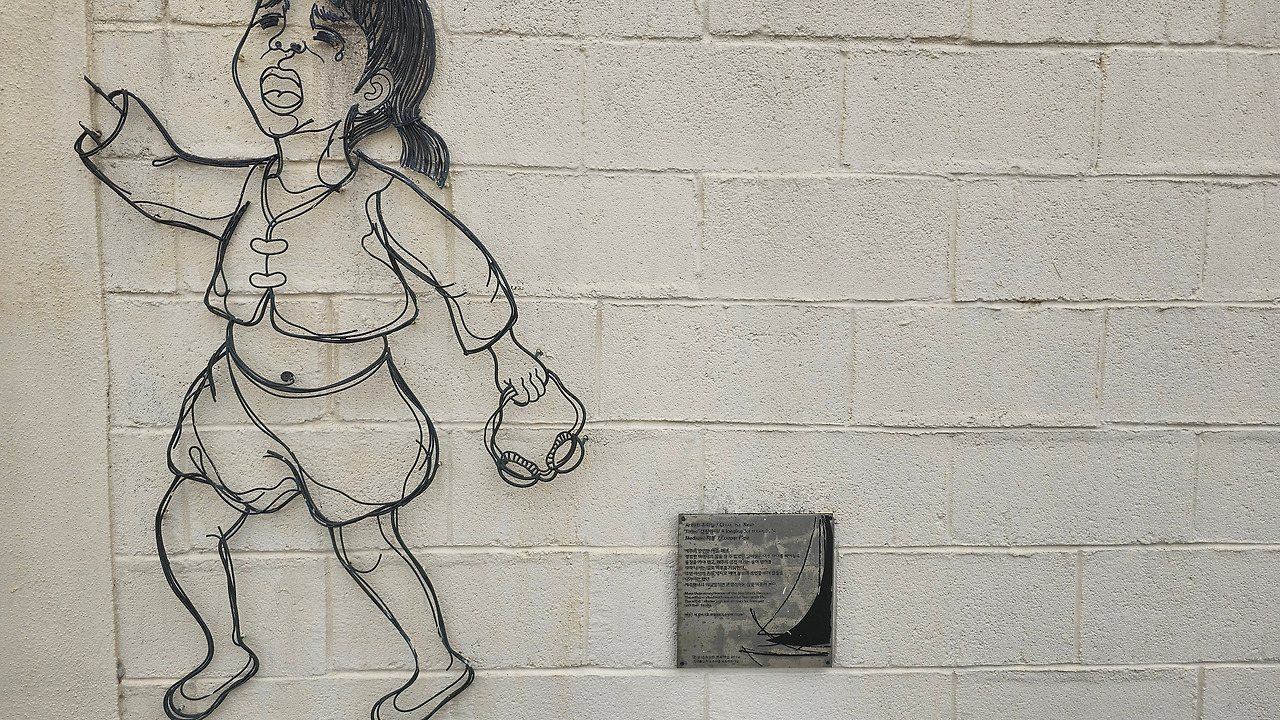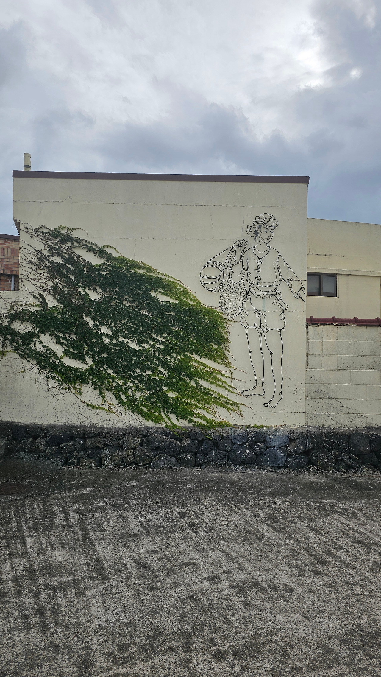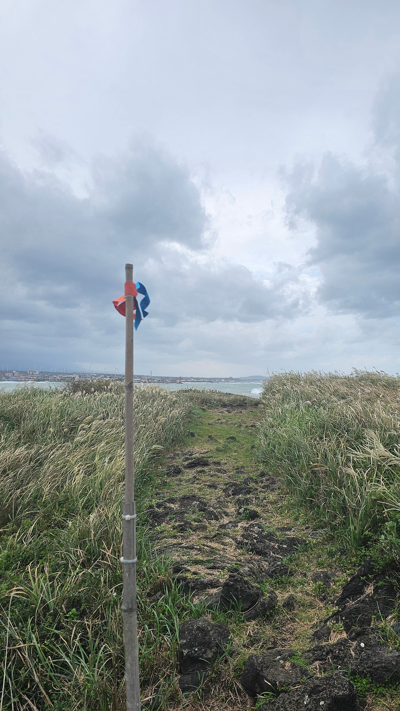 김녕해수욕장의 모래는 바람에 실려 도로를 덮고 있었다. 도로의 모래는 다시 바람에 날려 다른 곳으로 낮게 깔리며 날아갔다. 해변엔 당연히 사람들은 없었다. 김녕마을에 들어섰으나 마을의 외곽에 있는 해안 길로 올레는 나 있었다. 여전히 파도와 바람은 거셌다. 길 여기저기에 바람에 휩쓸려 날아온 쓰레기와 고기잡이 도구들이 잔해처럼 어지럽게 놓여있었다. 등대인 도대와 지금은 바닷물에 잠긴 밧줄구조나 치약구조와 같은 용암의 흔적이 있는 조간대를 지났다. 철사로 엮어 만든 벽화에 눈길이 갔다. 물질 나가는 해녀와 물안경을 들고 울고 있는 소녀의 모습이었다. 소녀는 물질을 배우고 싶은데 엄마가 배우지 못해서 우는 것인지 아니면 물질을 배우고 싶지 않아서 울고 있는 알지 못하겠다. 다만 엄마의 눈 감은 표정으로 봐서는 따라오지 못하게 한 것은 아닌가 생각했다. 드디어 김녕서포구에 도착했다. 스탬프를 찍고 잠시 쉬며 물을 마셨다. 오후 2시 50분이었다. 그런데 오늘 19코스를 완주할 수 있을까?