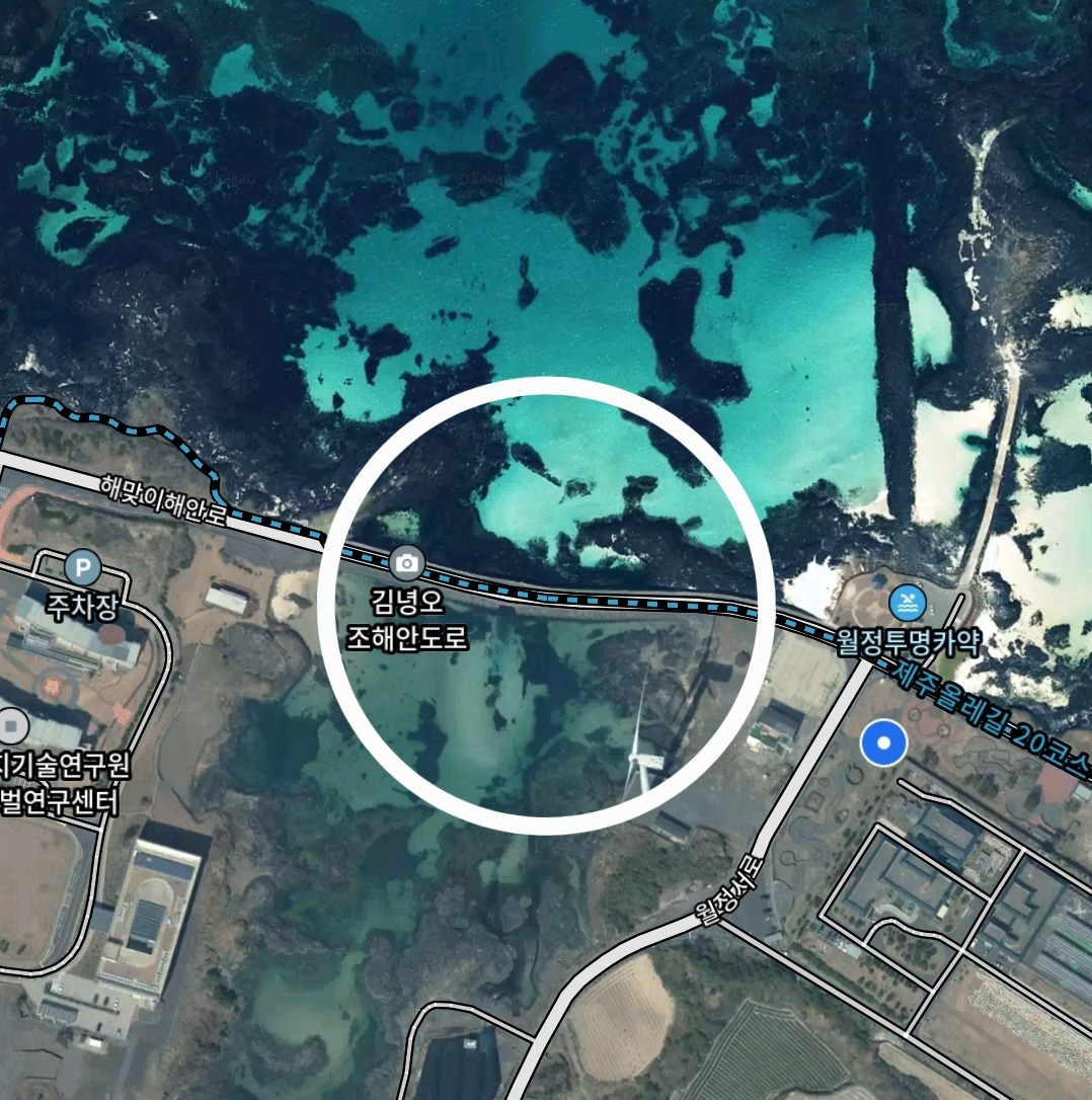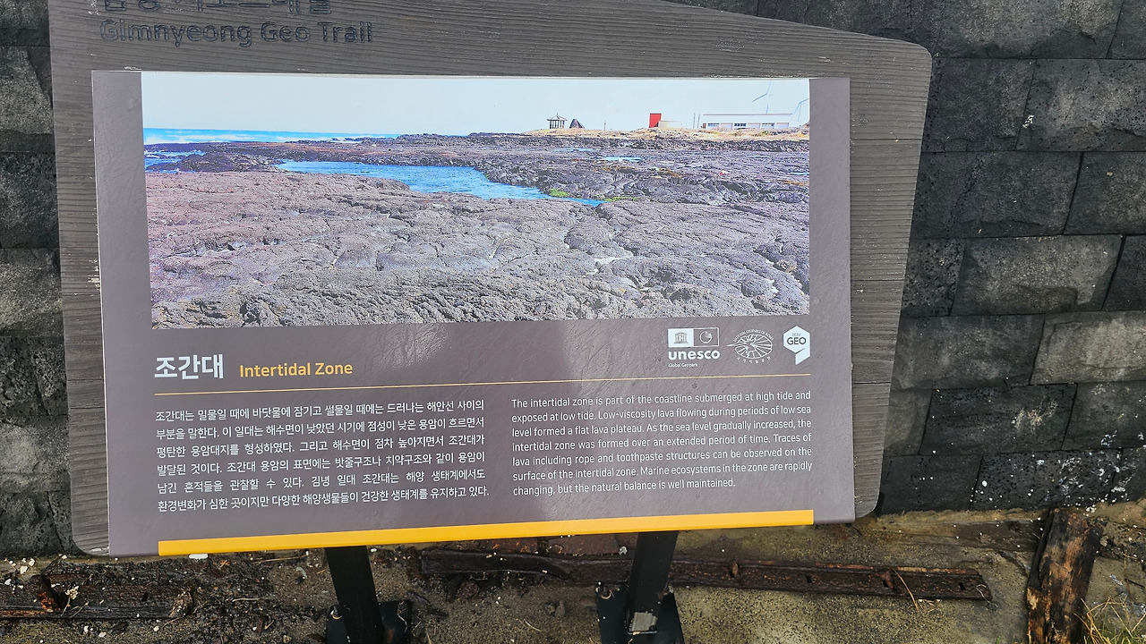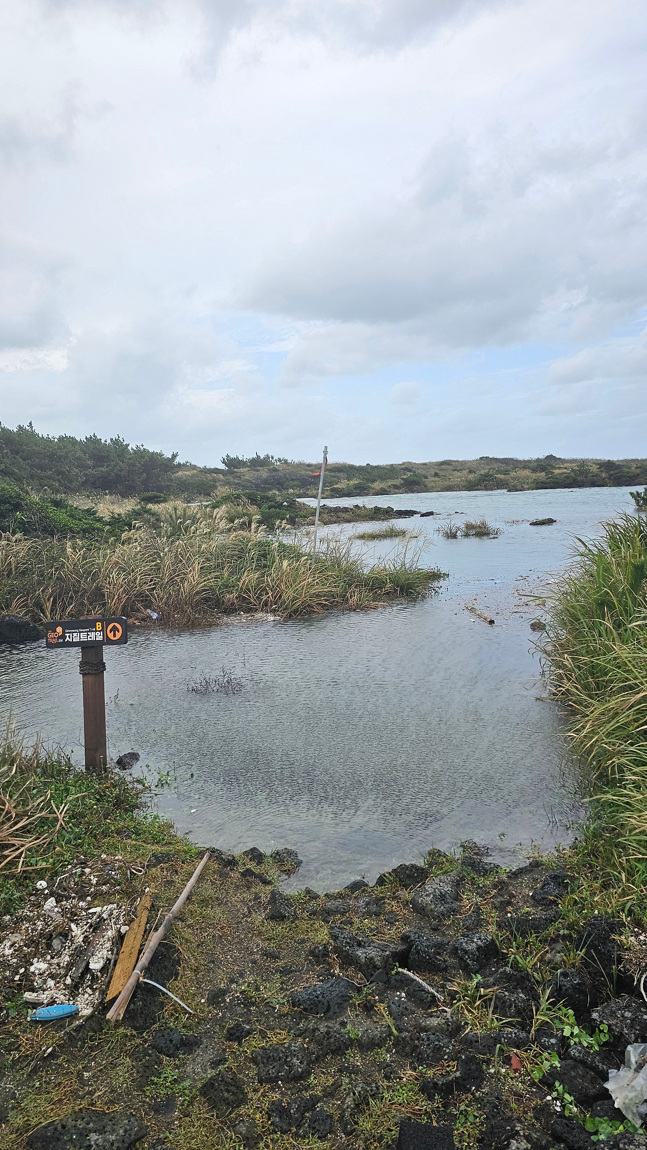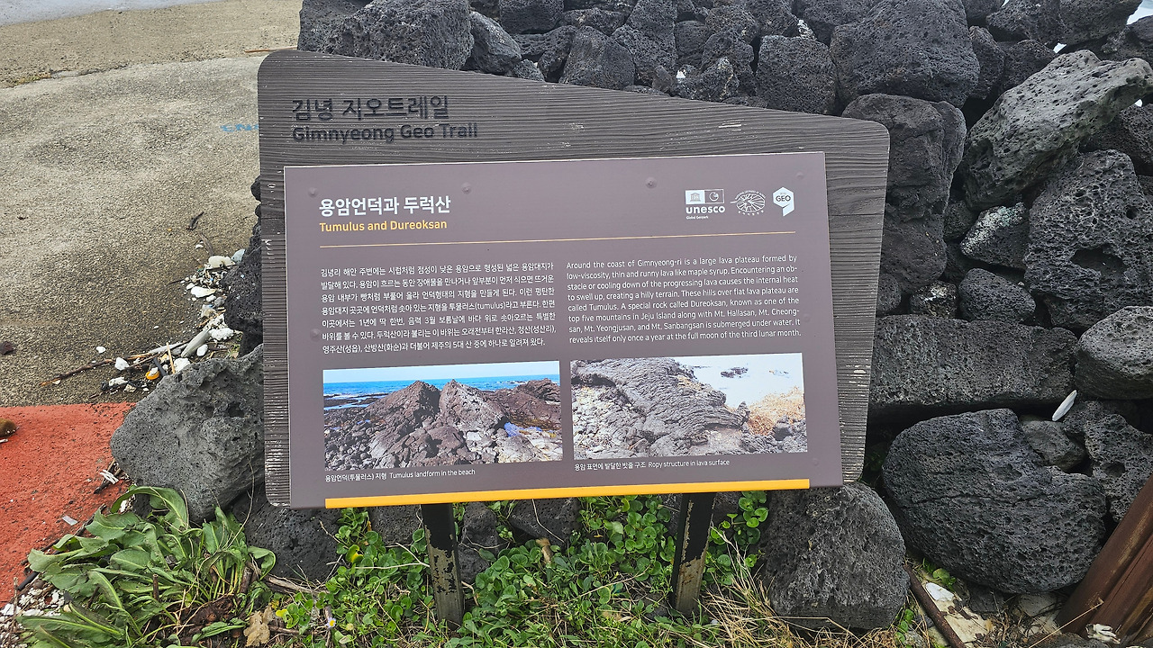 20코스에서 제주밭담 테마공원부터 시작점인 김녕서포구까지는 거의 해안 길이다. 다만, 해안 길은 해안도로를 따라가지 않는다. 벗어나 있다. 이런 해안 길도 세 부분으로 나눌 수 있다. 덩개해안과 성세기 태역길 그리고 김녕마을의 길이다. 그리고 덩개해안과 김녕해수욕장이 포함된 성세기 태역길은 ‘김녕 지오트레일’로 지정되어 있다(다른 날이면 이곳은 용암에 의해 형성된 다양한 모양의 용암 흔적을 볼 수 있다. 그러나 바닷물에 잠긴 이날은 그 흔적을 볼 수 없었다). 그녀들은 사진을 찍으며 걸어서인지 속도가 느렸다. 무척 즐겁고 재미있어하는 느낌이었다. 시간에 쫓겨 여유가 없던 나는 즐기고 있는 그녀들을 앞질러 갔다. 해안도로를 짧게 걸은 후, 도로에서 옆으로 난 길로 빠졌다. 바다로 향한 검은 바위투성이로 된 넓은 곳이 있었다. 이곳은 투물러스(2코스 식산봉에 가기 위해 걸었던 내수면에서 언급되었다)라 불리는 지형이었다. 이 해안을 덩개해안이라고 부른다. ‘덩개’에서 ‘덩’은 바위를, ‘개’는 바다를 뜻한다. 즉 ‘덩개’는 바위가 있는 바다란 의미이다.