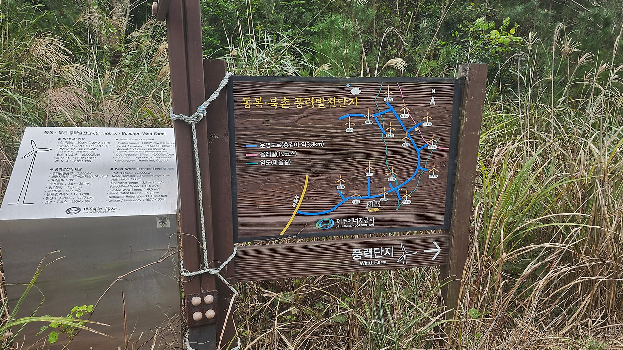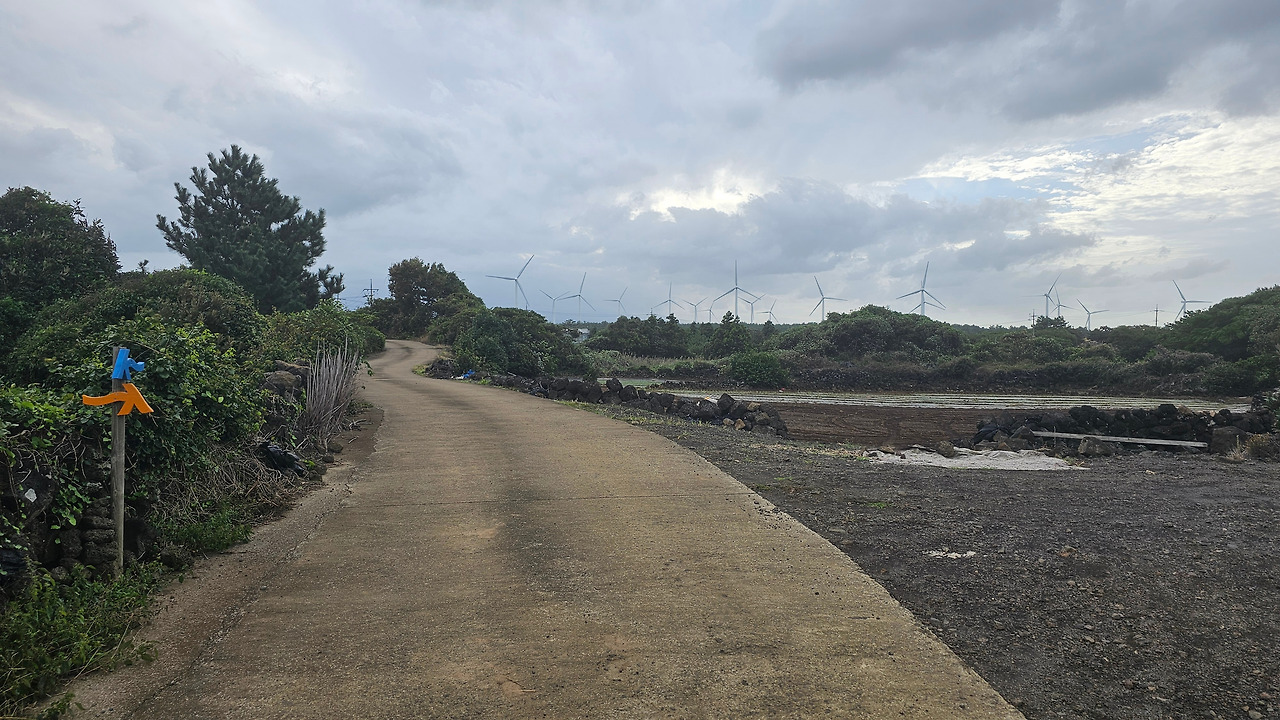 또한 이곳에도 15대의 풍력발전기가 몰려있었다. 밭길을 걸으면 어느 순간 여러 대의 풍력발전기가 나무들 뒤로 우뚝 솟아있는 풍경을 볼 수 있다. 동북·북촌 풍력발전 단지였다. 이번 올레에서는 유독 풍력발전기가 많이 보인다. 대부분은 바다에 있었다. 간혹 육지에도 있었지만 이렇게 몰려있는 곳을 보진 못했다. 그런데 생각해 보니 저번 2코스 대수산봉의 전망대에서 한라산 방향에 여러 대의 풍력발전기를 본 것 같았다. 사진을 찾아보니 있었다. 카카오맵의 항공사진을 보니 '제주자연생태공원' 근처였다. 제주는 어디나 바람이 불었다.