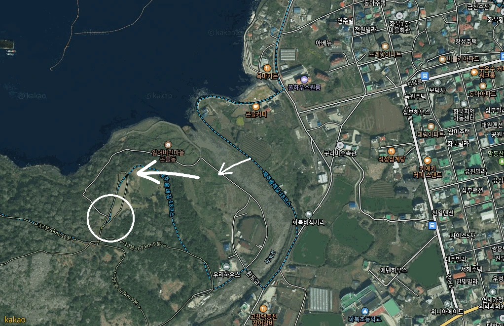 길은 바다로 작은 호를 그리다 화북천을 타고 내륙으로 올라갔다. 여기에서 4·3 유적지인 곤을동 마을을 만났다. 더 정확히는 안내석을 만났다. 마을은 없었고 제주 4·3 사건 당시 초토화되어 마을 터만 남았다. 화북천 건너편에 풀로 덮인 돌담들이 보였다. 그곳이 지금은 사라진 곤을동 마을이었다. 카카오맵을 보면 그곳은 ‘잃어버린 마을 곤을동’으로 표기되어 있다. 서울로 올라와서 곤을동에 대해 알아봤다. 곤을동 터에 가면 ‘잃어버린 마을 곤을동’이라는 안내판이 있고 당시 일어난 일을 다음과 같이 간략하게 적고 있었다.