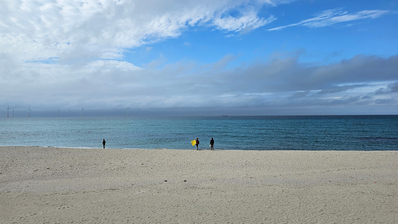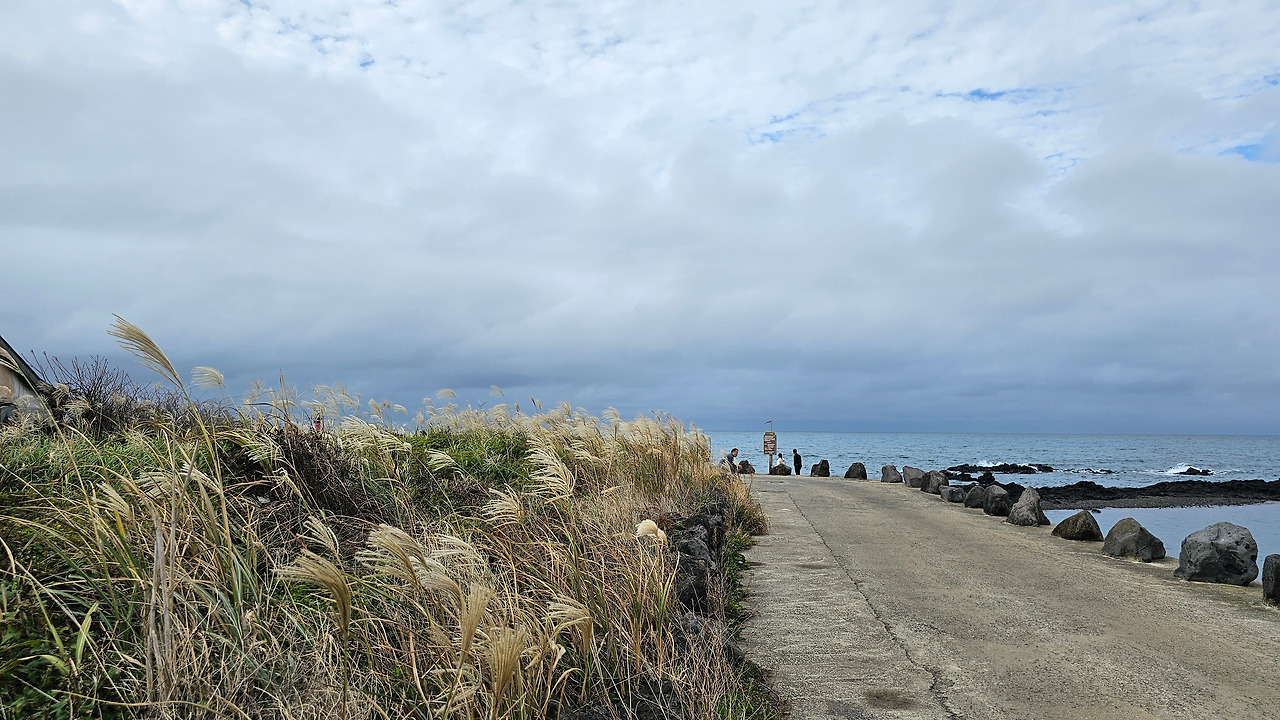 정자정천을 건너 오른쪽으로 꺾으면 길은 해안으로 곧장 달려간다. 왼편의 갈대들이 흔들렸다. 바람이 불어오고 있었다. 불안한 징조였다. 길의 끝에 두 남녀가 걱정스러운 듯 바다를 보고 있고, 한 남자는 갈대 쪽에 앉아 멜랑콜리 한 생각에 잠겨 있는 것 같았다. 안내판에 묶여있는 올레 리본이 강하게 흔들렸다. 어두워 오는 바다와 하늘이 압도하고 있는 풍경이었다. 바람과 함께 불안의 정도가 더 짙어갔다.