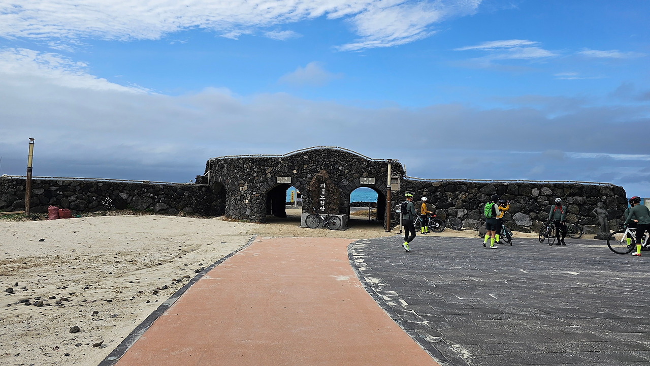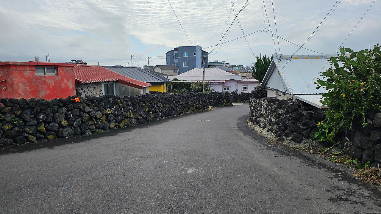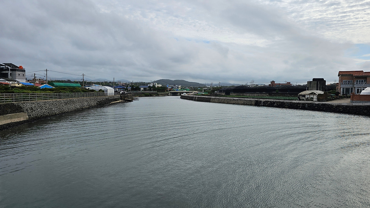 곽지해수욕장을 벗어난 길은 한산한 금성리 마을 길을 지나 중간스탬프가 있는 해안가에 다시 닿았다. 금성포구였다. 하늘은 구름으로 가득 찼고 수평선 부근의 구름은 검정에 가까운 짙은 회색으로 변해있었다. 중간스탬프를 찍은 기쁨도 못 느끼고 바로 떠났다. 바로 옆에 곽금 6경(곽지해수욕장에 있던 곽금 8경은 무엇이지?) 중 하나라는 정자정천(금성천)이 금성포구로 흘렸다. 한라산에서 발원하는 두 개의 큰 물줄기가 금성리에 합쳐서 금성포구의 바다로 흐른다고 한다. 상류의 내가 정자모양의 물줄기라서 정자정천이라는 이름이 붙었다. 정자정천은 평소에는 건천이었으나 새벽부터 내린 비 때문인지 물이 가득 차 있었다.
