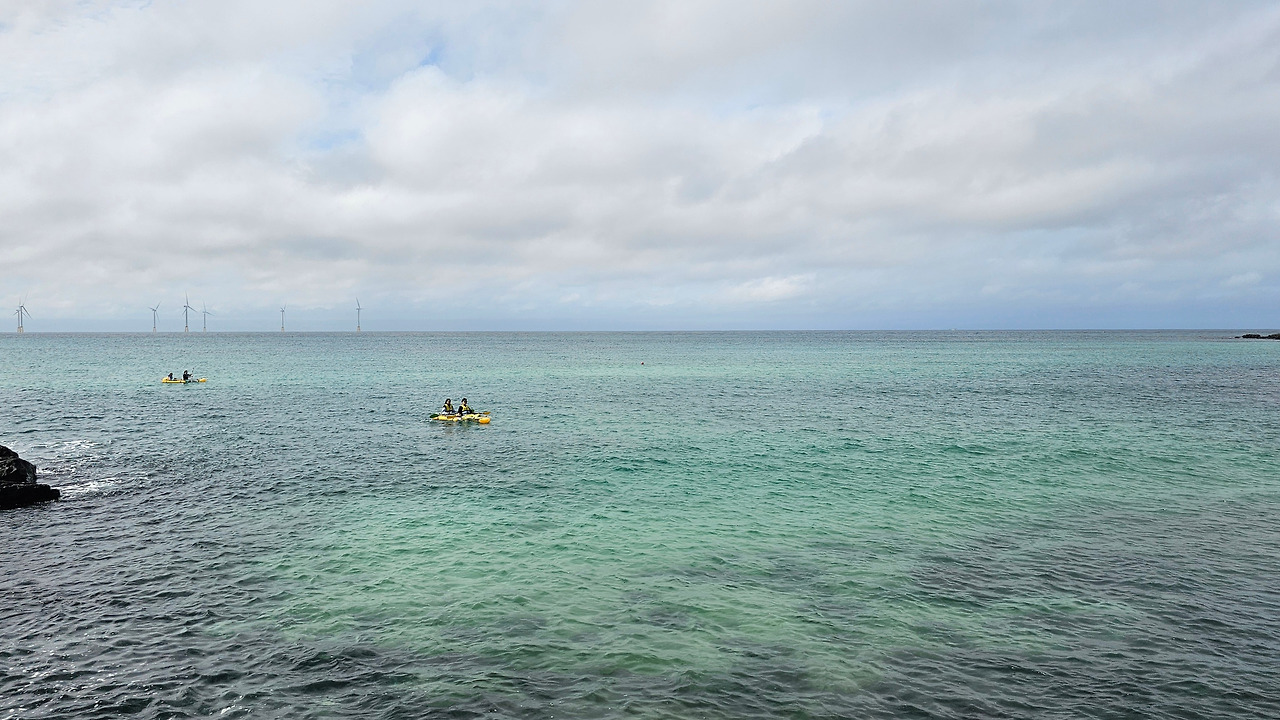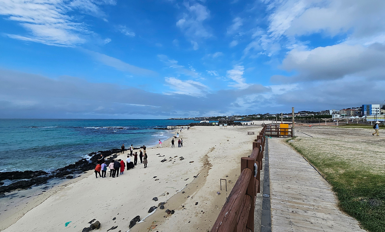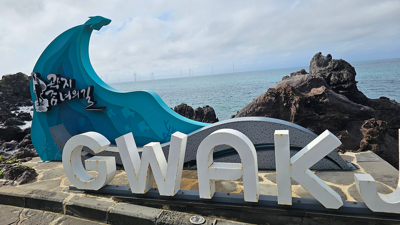 산책로는 해안절벽 밑을 따랐다. 바다를 보았다. 에메랄드빛이 곳곳에 풀어져 있었다. 햇빛을 받아 윤슬이 반짝였고 젊은 연인들이 카약인 듯, 바닥에 바다를 볼 수 있는 투명한 작은 배를 타고 에메랄드빛 바다에 부표처럼 떠 있었다. 곽지라고 하얀 글자들이 세워져 있다. 곽지 해변으로 이어지나 보다. 글자 뒤에 남색, 감청, 파랑, 바다색의 그러데이션 된 파도 형상의 조형물이 있다. 파도의 끝에 하늘로 도약하려는 작은 돌고래가 파도를 끌고 있다. 파도 조형물에 ‘곽지 잠(아래아)녀의 길’이라고 적혀 있다. 잠(아래아)녀는 해녀의 제주어이다. 해안산책로는 정한철산책로와 곽지 잠(아래아)녀의 길로 이루어진 듯했다.