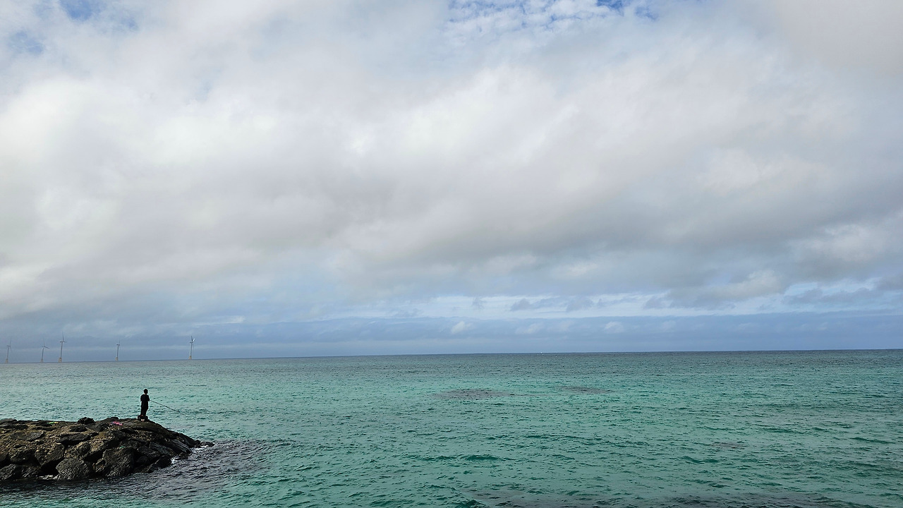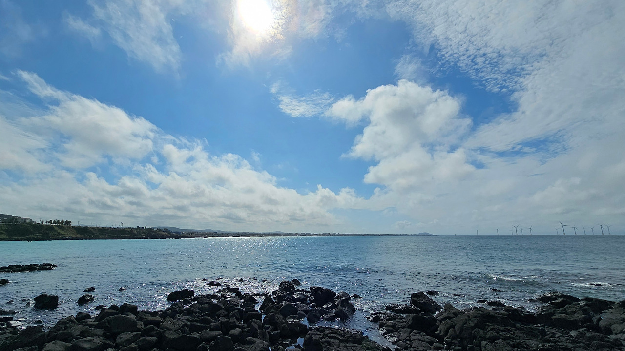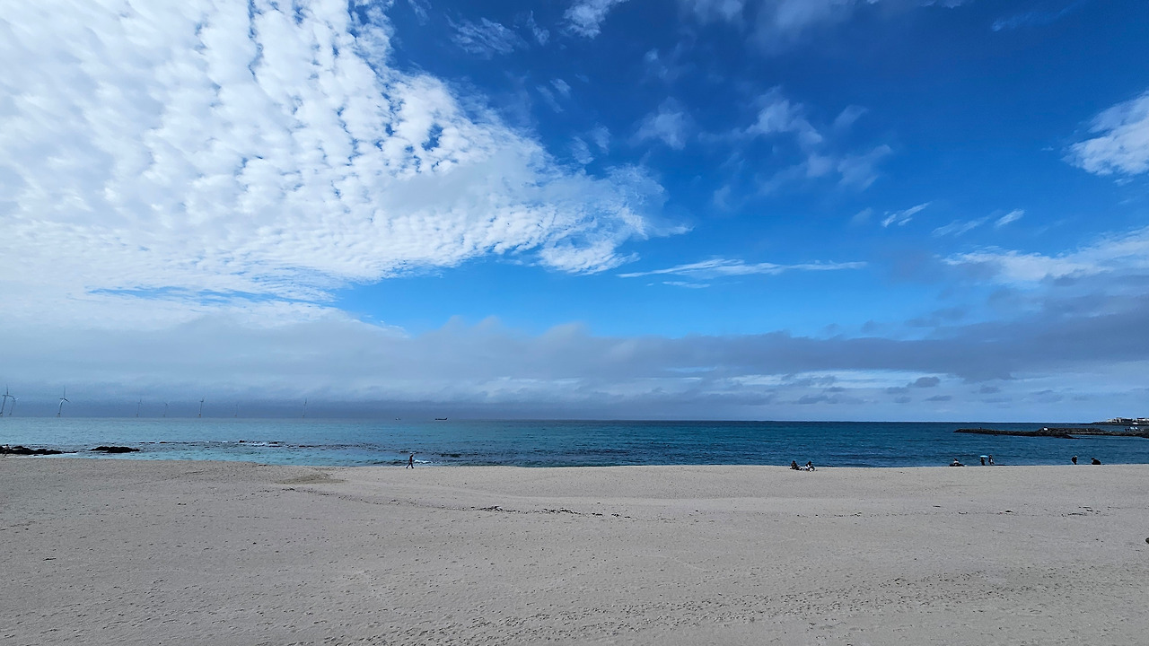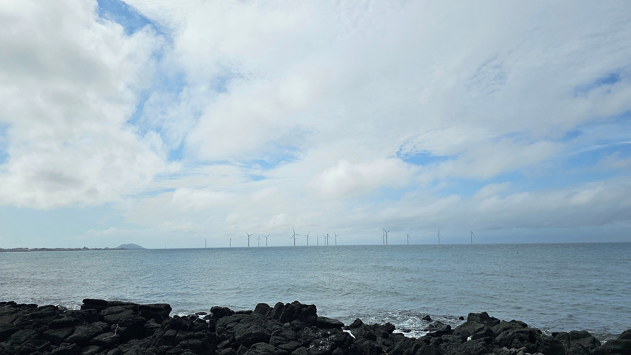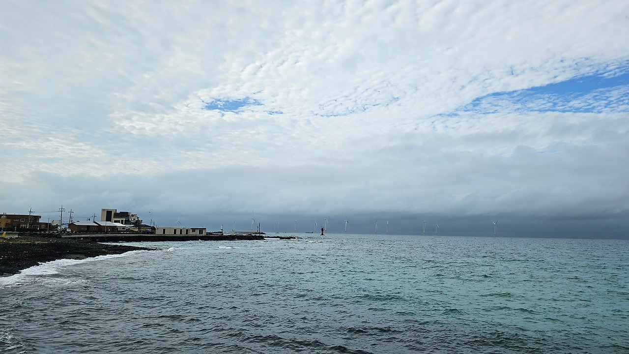 사람들은 밭담과 카페 출입문 사이에 있는 골목에서 나오지 않았다. 카페 뒤, 바다와 면한 길에서 올라왔다. 올라오는 이들을 거스르며 내려갔다. 길은 검은 현무암 해변과 카페 사이를 구분하는 띠처럼 놓여있었다. 검은 현무암 해변은 폭이 좁았고, 파도가 길로 넘어오지 못하게 온몸으로 막아냈다. 넓게 펴진 하얀 구름이 하늘에 낮게 드리워져 있었다. 구름에 하늘의 푸르름은 묻혔다. 색을 잃어가는 하늘을 닮아가듯 바다도 파랑을 잃어갔다. 멀리 풍력발전기들이 얇은 바늘처럼 뾰족하게 솟아 낮게 드리운 구름을 위협했다. 더 멀리 작은 오름이 보였다. 지도를 보니 지날 길엔 오름이 없었다. 자세히 보니 한림항에 있는 비양도 같았다. 저기까지 가야 이번 올레가 끝나는구나. 13시 10분인데, 3시간 안에 도착할 수 있을지. 걸음을 빨리했다.