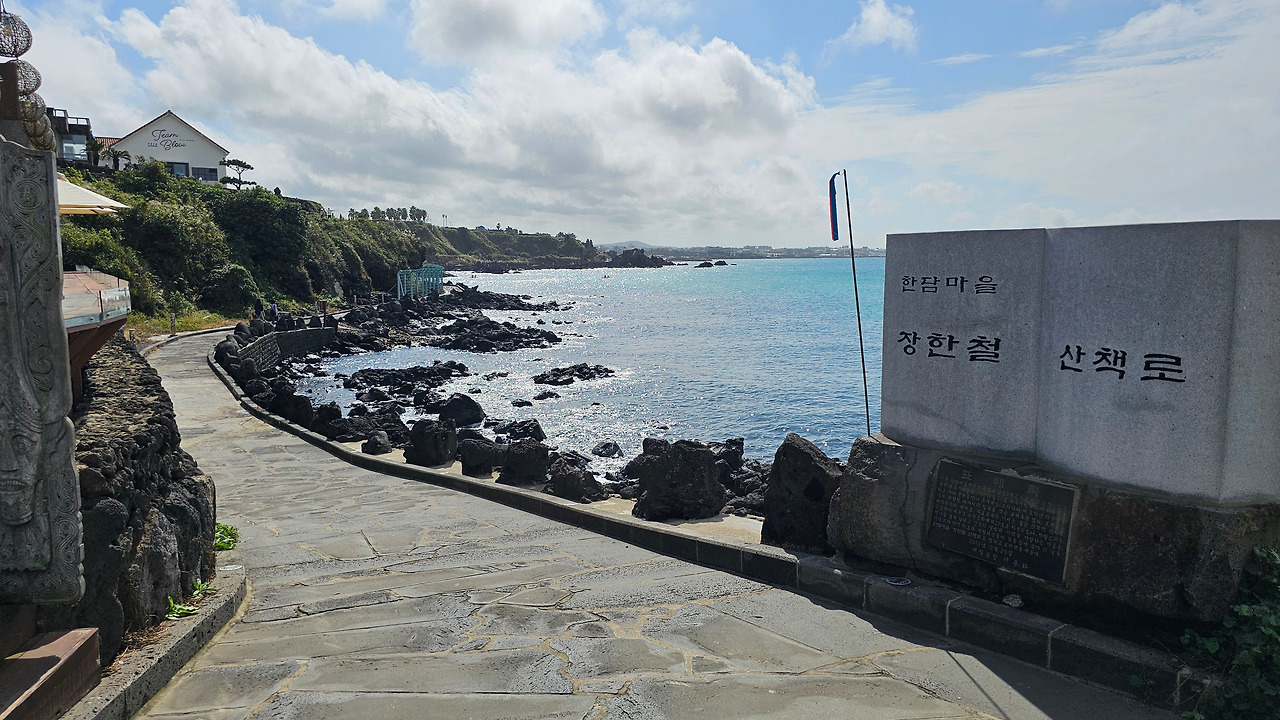 초가로 된 장한철의 생가로 오르는 계단이 있었다. 그러나 출입을 막기 위해 줄이 처져있어 올라갈 수 없었다. 발길을 돌려 작은 한담 해변을 지나 장한철을 기념하기 위해 이름 지어진 장한철산책로를 걸었다. 장한철산책로를 알리는, 펼쳐진 책 모양(표해록 같았다)의 안내석을 보면서 장한철 생가는 애월카페거리와 한담해변산책로를 잇는, 앞표지와 뒤표지를 연결하는 책등과 비슷하다는 생각이 들었다.