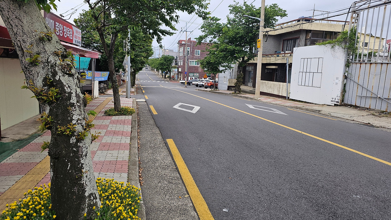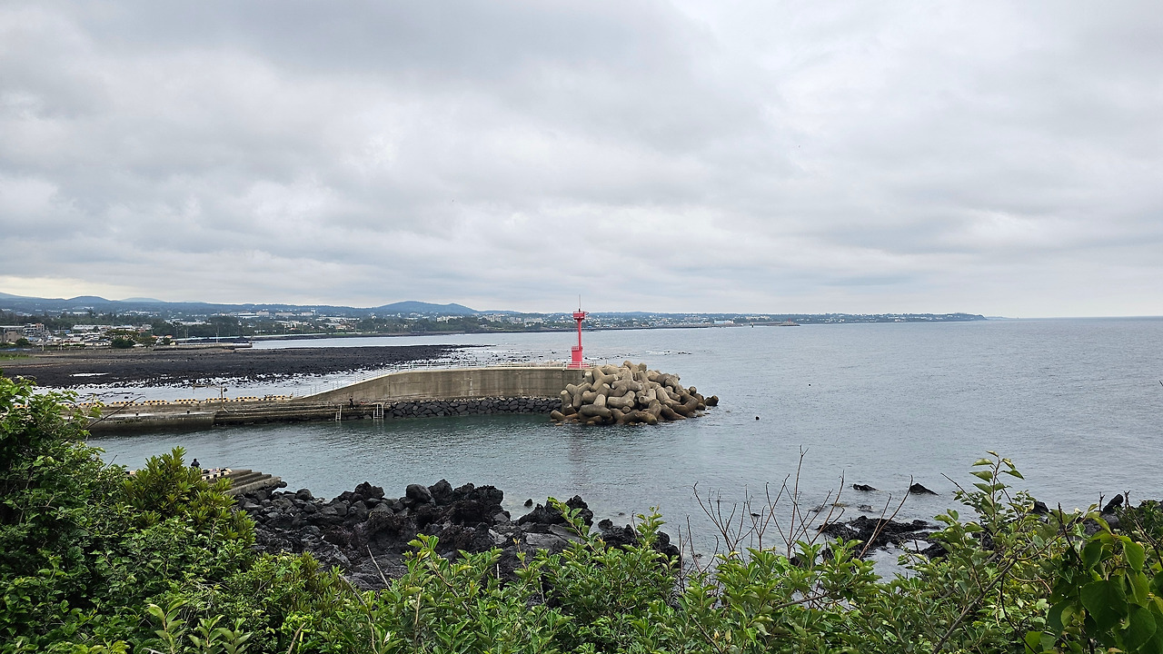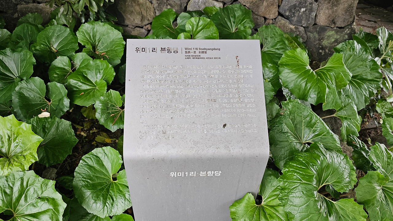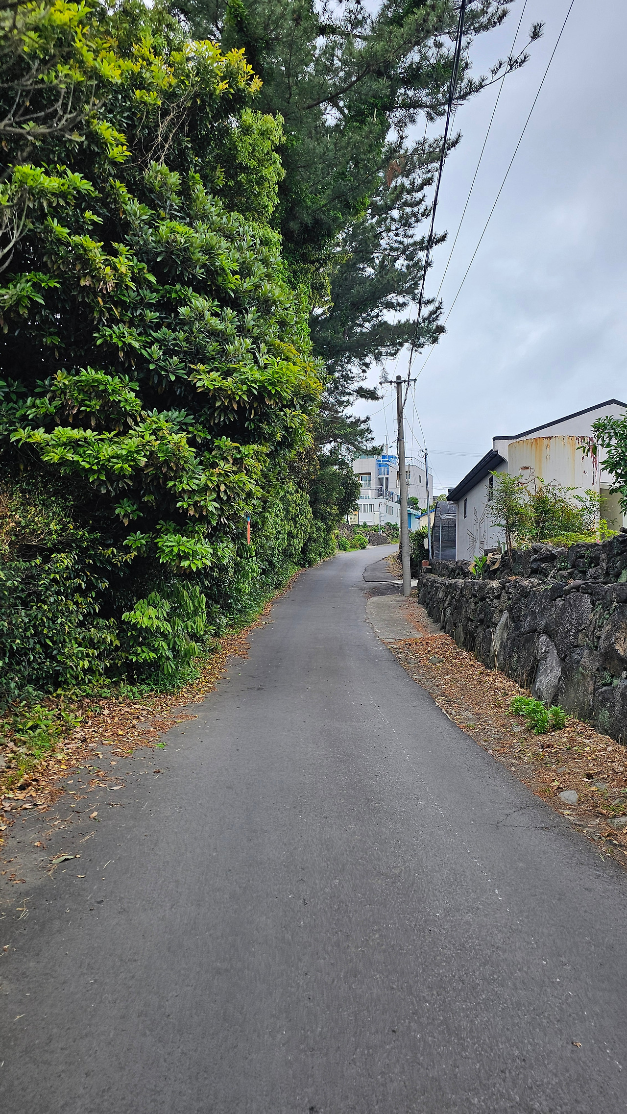 조급함으로 인한 빨리 걷기는 무릎의 통증도 유발했다. 오늘 쉬지 않고 걸었던 피로가 누적된 결과지만 하필 빨리 걷고 있을 때 통증이 왔다. 다행히 마을에 약국이 있어 진통제와 파스를 샀다. 이 둘은 올레 내내 함께했다. 사실 위미항은 무척 컸다. 길이 항구 둘레를 돌아서 빠져나는데 다른 곳에 비해 시간이 더 걸렸다. 항구가 큰 만큼 마을도 커서 병원과 약국이 있을 수 있었다. 조급함과 통증 때문인지 경로를 벗어났다. 약국을 지나 다시 위미항으로 내려가 건천을 건너 작은 포구 같은 곳으로 가야 했는데 나는 그냥 도로를 따라가다 위미항이 보이는 곳에서 내려가 포구에 닿았다. 포구에서 조금 더 걸으면 수령이 350년 된 지정 보호수인 해송이 있고 그 맞은편에 마을을 지켜주고 어업을 관장하는 풍농신과 해신을 모시는 위미1리의 본향당이 있다. 본향당의 나무들과 해송이 어우러져 하늘을 가렸다.