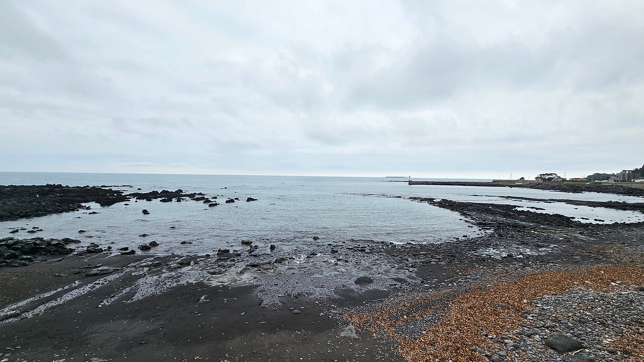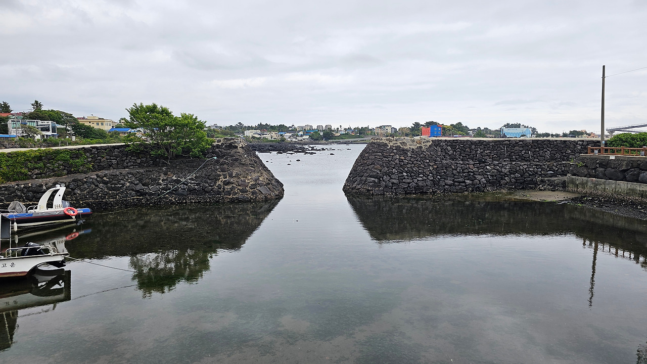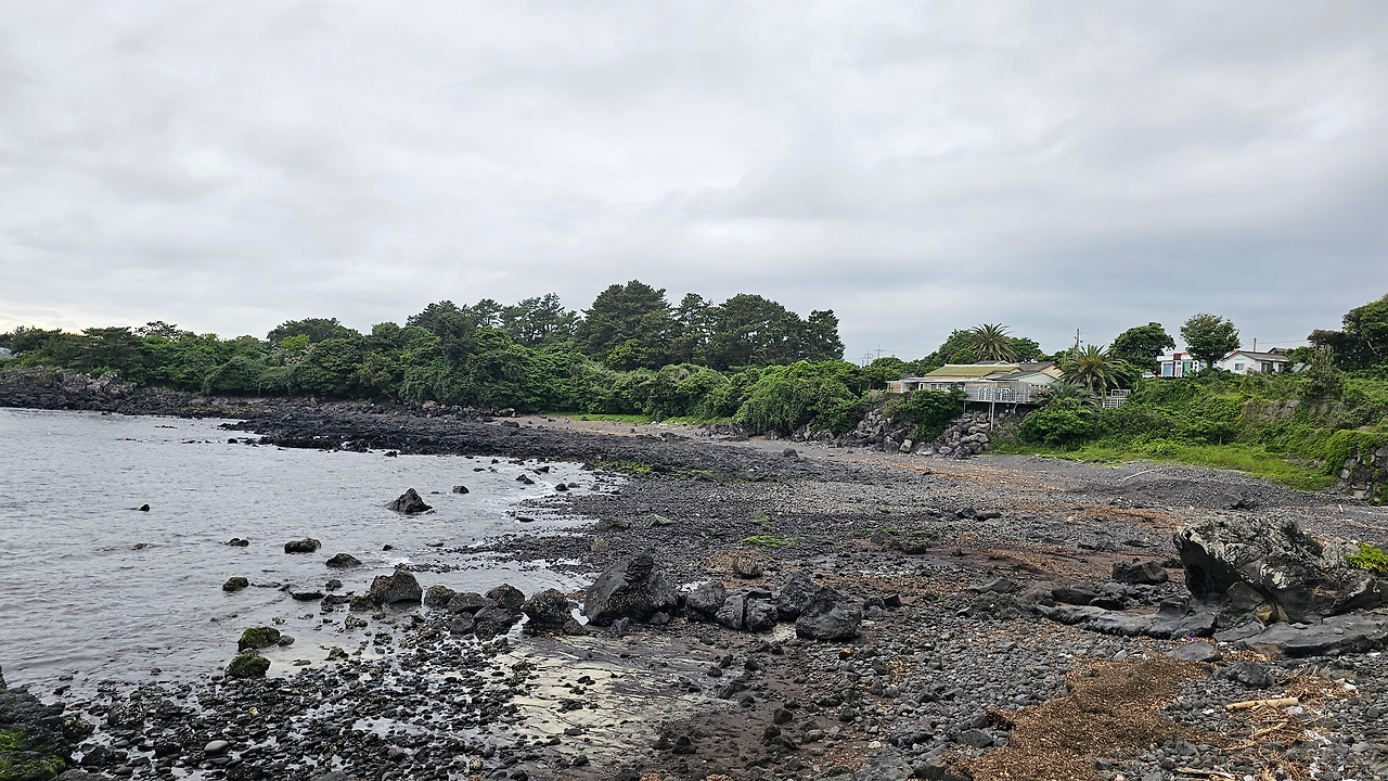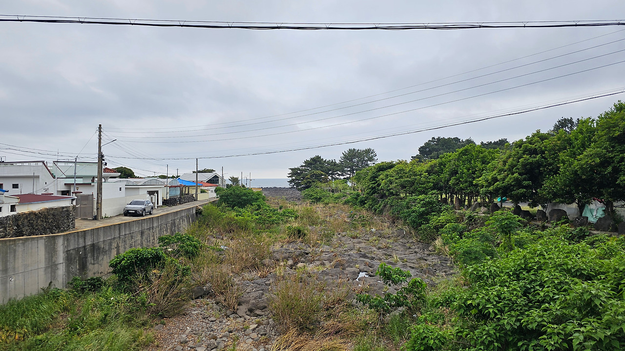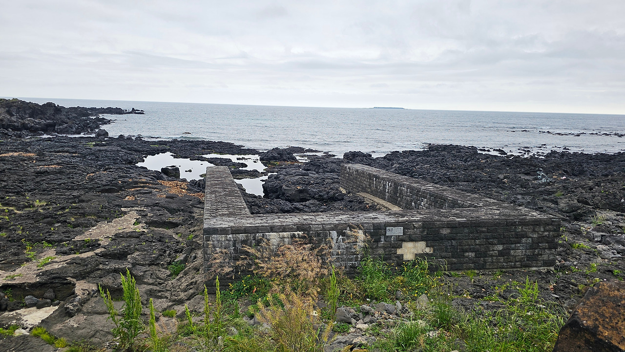 현무암 가드레일이 끝난 곳에서 길은 밭과 집들이 섞인 마을로 길게 돌아 ‘넙빌레’에서 바다와 다시 만났다. ‘넙빌레’는 ‘넓은 바위’를 뜻하고 이곳에는 차가운 용천수가 솟아 나오는데 지역 주민들의 여름철 피서지로 유명하다고 한다. 여자는 동쪽, 남자는 서쪽에서 노천욕을 즐긴다. 또한 이곳의 물은 수질이 좋아서 일제강점기에는 소주의 원수로도 사용했다고 한다. 앞바다는 수심이 얕아 현무암 돌들로 바다를 막아 밀물에 들어와 썰물에 빠져나가지 못한 물고기를 잡는, 제주 원시 가두리 어업인 원담도 있다고 한다. 제주의 남쪽 해안을 걸으면서 원담은 처음 들어본 것 같았다. 북쪽은 자주 들었고 보기도 했다. 남쪽 해안이 북쪽보다 깊고 절벽도 많다는 증거는 아닐지.
