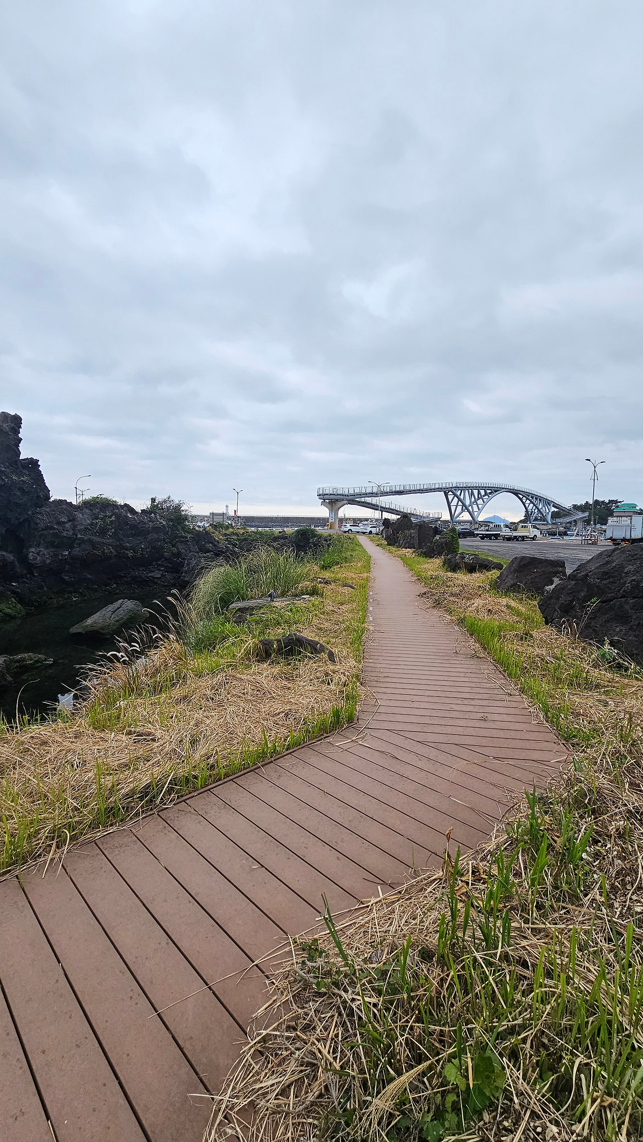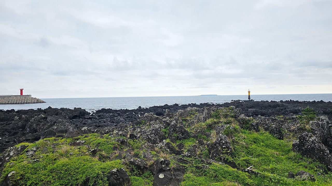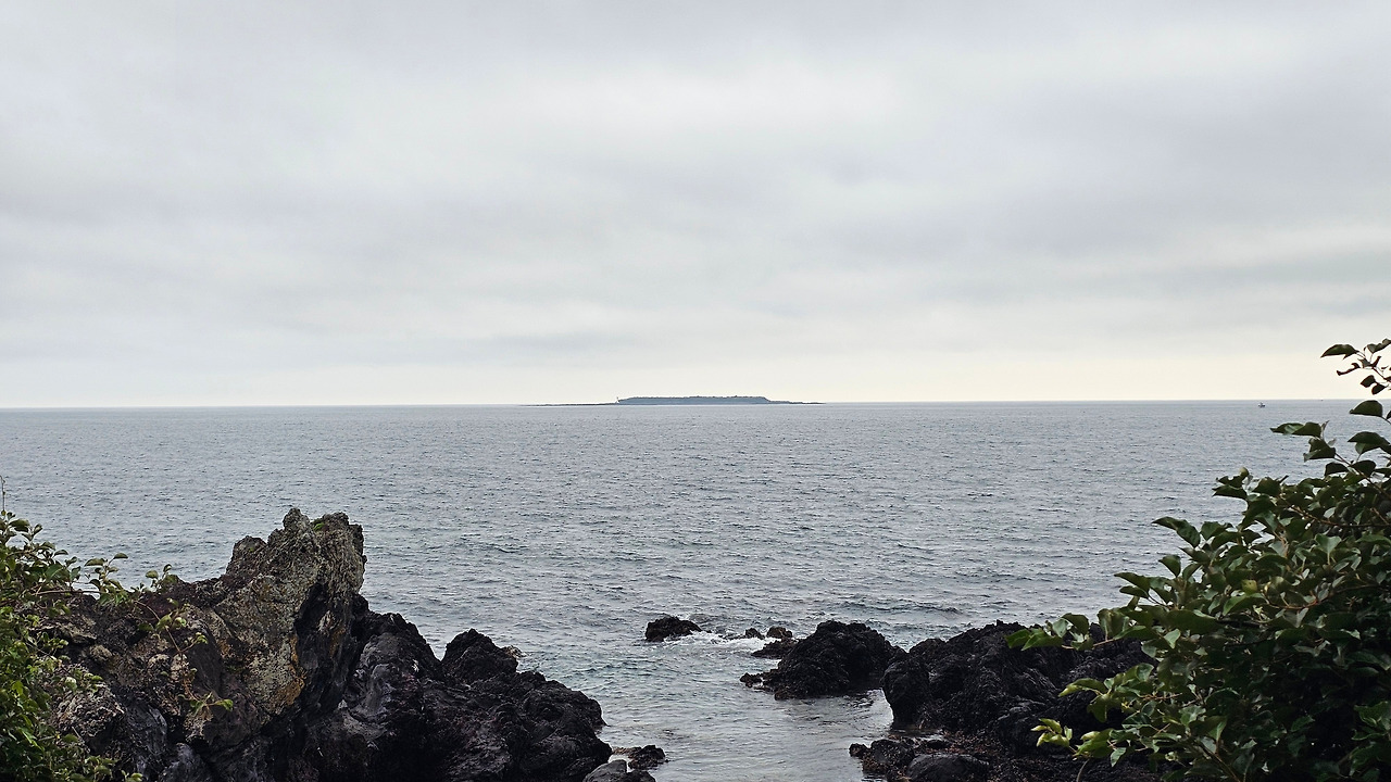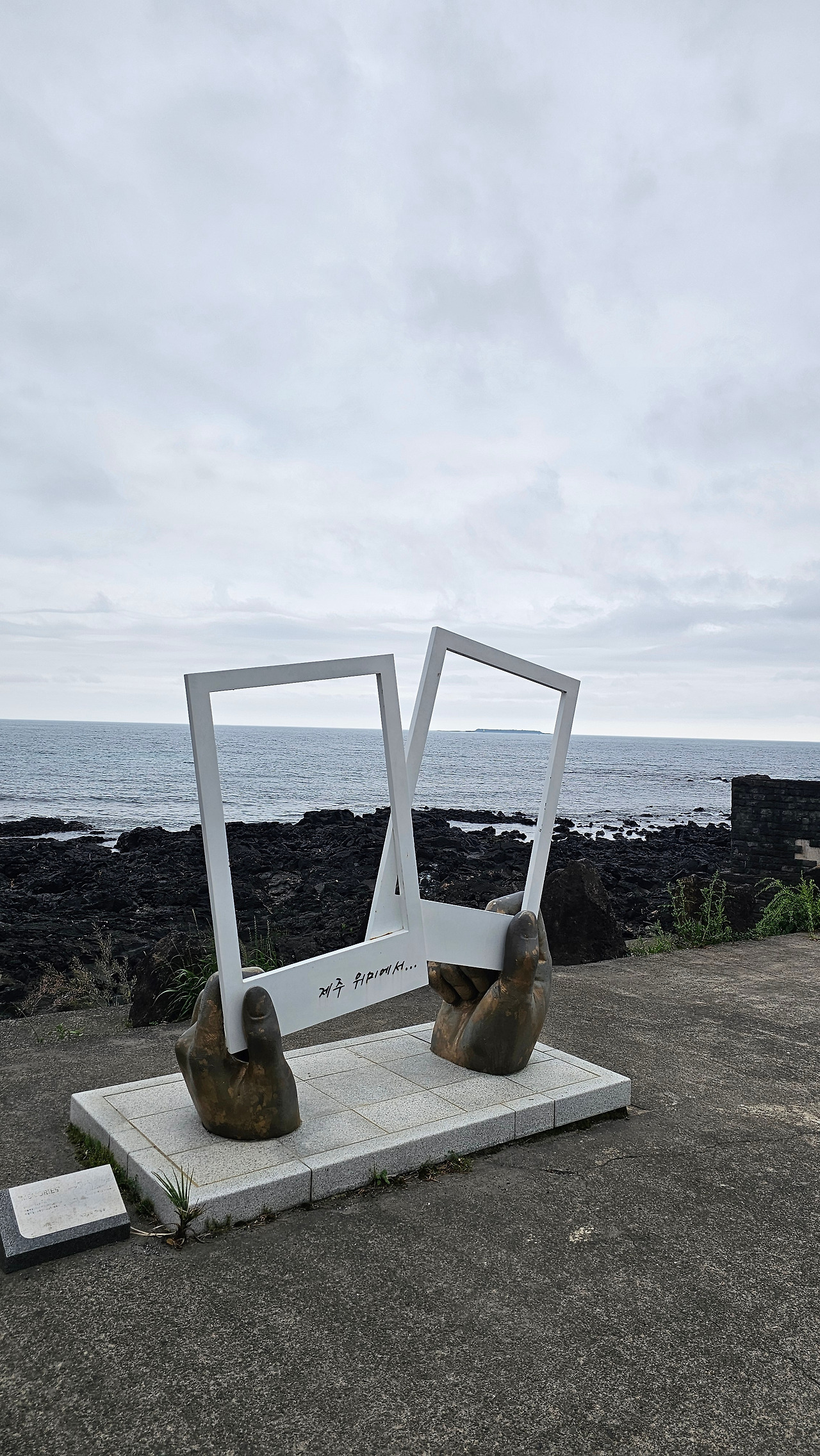 바다를 배경으로 추억을 남길 수 있는 포토존도 있었다. 포토존의 플레임 안에 바다 위에 떠 있는 직사각형의 평평한 섬이 보였다. 지귀도(地歸島)였다. ‘땅이 바다로 들어가는 형태’라는 의미이고 그래서인지 대한민국에서 가장 낮은 땅이라고 한다. 이곳에 제주 신화의 주인공인 설문대할망의 흔적이 있다.